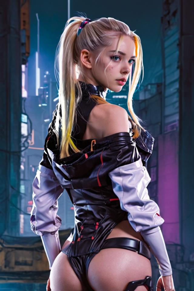Prompt 1girl wearing lucy-outfit, very long blonde hair,jacket,bare shoulders, ponytails, futuristic cyberpunk city background, serious, aesthetic pose, <lora:armorify:1> <lora:Realistic000003_1_2.5DAnime_0.05_Merge1:0.8>