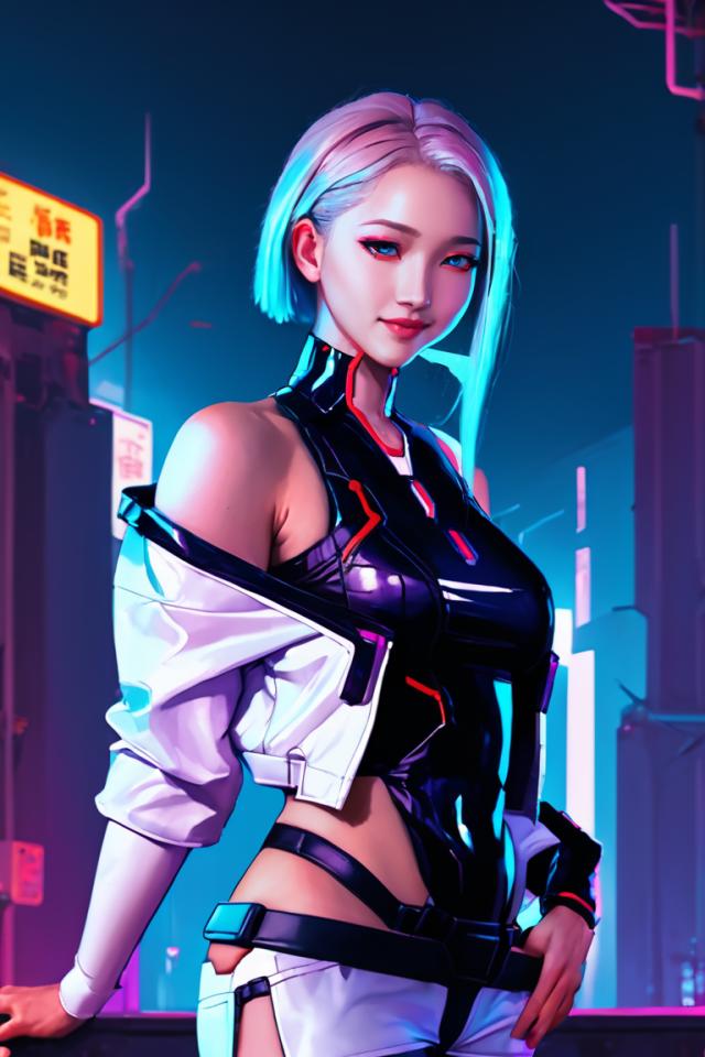 Prompt 1girl wearing lucy-outfit, jacket,bare shoulders, futuristic cyberpunk city background, light smile, aesthetic pose, <lora:armorify:1> <lora:Realistic000003_1_2.5DAnime_0.05_Merge1:0.5>