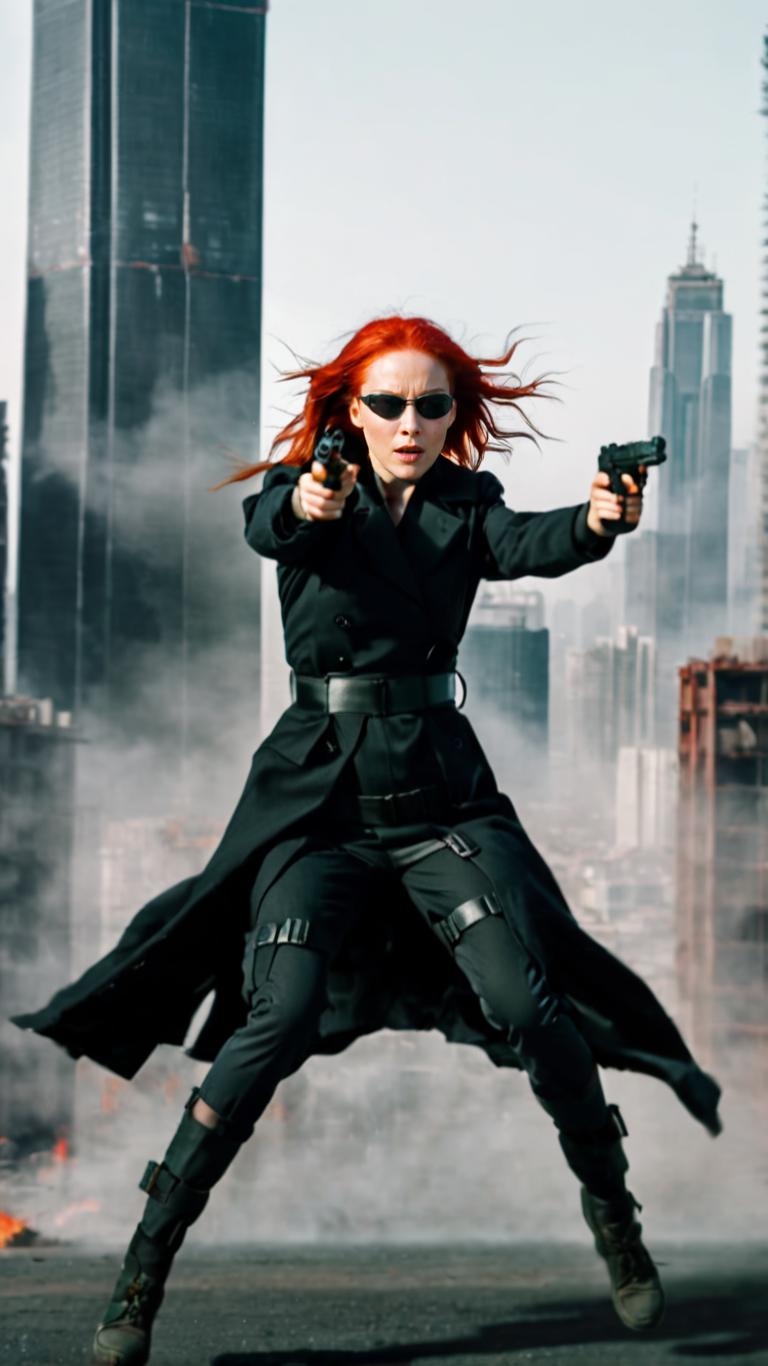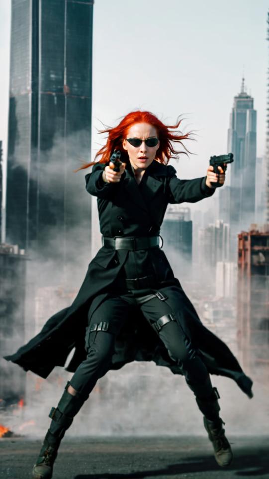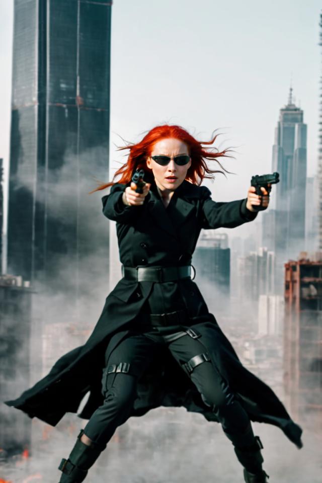 | Prompt | 1girl,wearing neo-outfit, long open black trench coat, sunglasses, very long red hair, dynamic,running,motion blur,holding guns, aiming at viewer, (jumping between skyscrapers, mid-air),((wind)), fighting stance, serious, focused, dystopic town background, (action movie,movie still, promotional poster), <lora:armorify:1> |