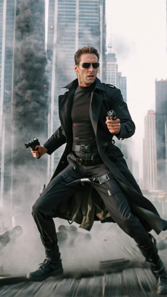 | Prompt | a tall male wearing (black neo-outfit), sunglasses, trench coat,male focus, dynamic,running,motion blur,holding guns, skyscrapers,((wind)), fighting stance, serious, focused, (action movie,movie still, promotional poster), <lora:armorify:1> |