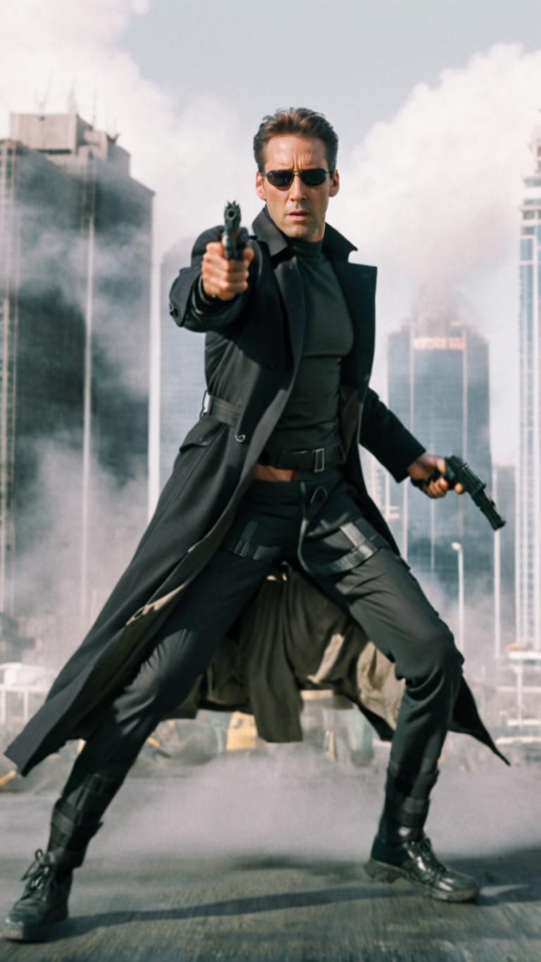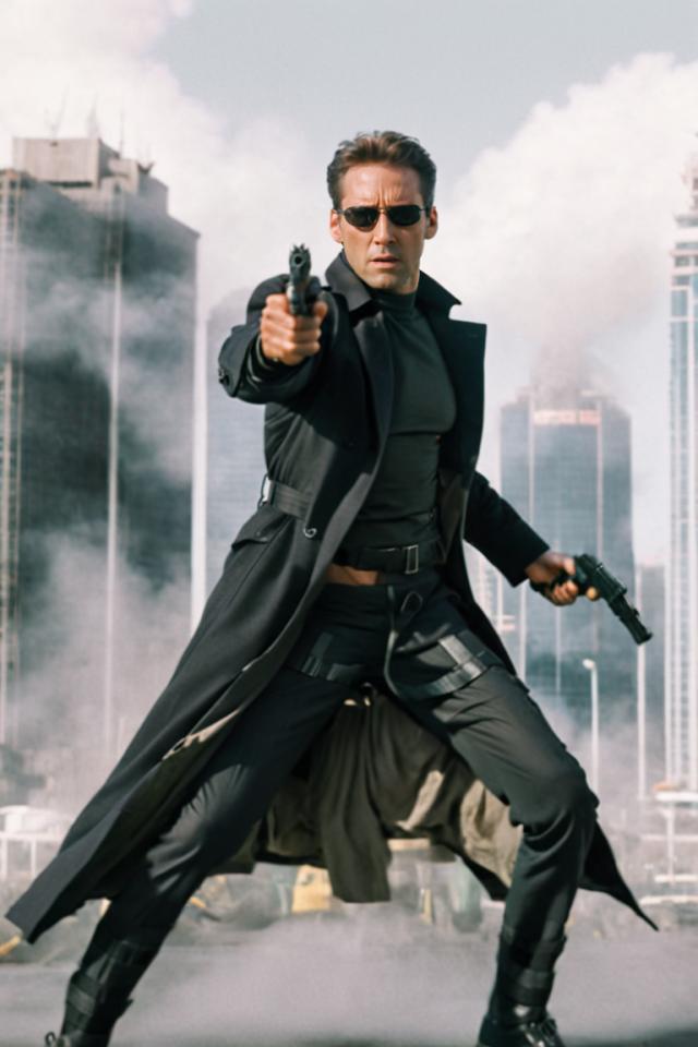 | Prompt | a tall male wearing (black neo-outfit), sunglasses, trench coat,male focus, dynamic,running,motion blur,holding guns, skyscrapers,((wind)), fighting stance, serious, focused, (action movie,movie still, promotional poster), <lora:armorify:1> |