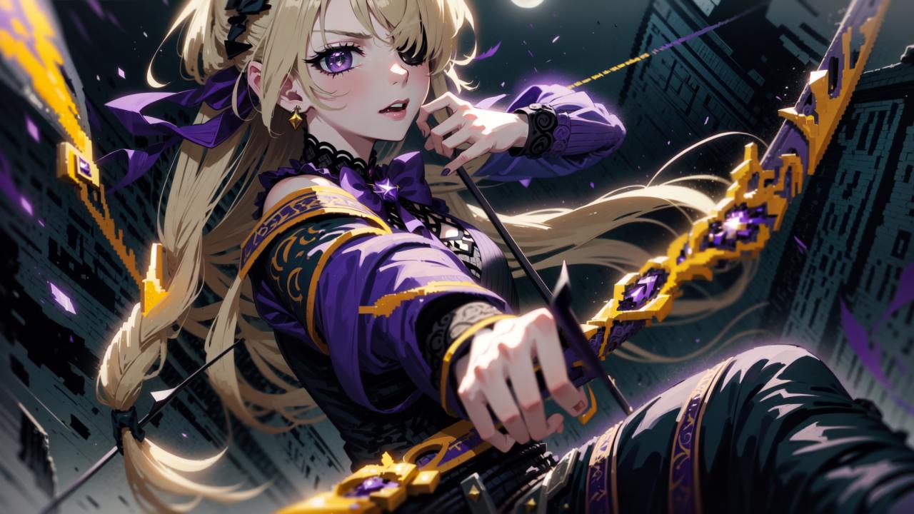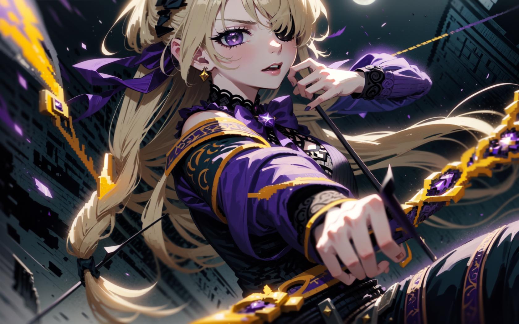 1girl, alternate costume, bangs, blonde hair, bow, bow (weapon), bowtie, braid, detached sleeves, dress, earrings, eyepatch, hair ornament, hair over one eye, hair ribbon, holding, holding bow (weapon) , holding weapon, jewelry, long hair, long sleeves, looking at viewer, moon, one eye covered, open mouth, parted lips, purple bow, purple bowtie, purple eyes, purple ribbon, ribbon, solo, two side up, weapon