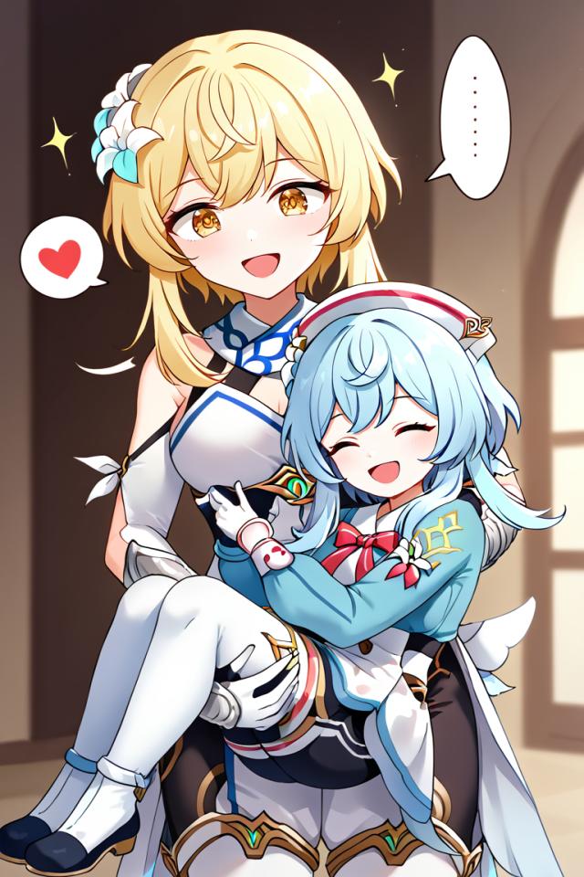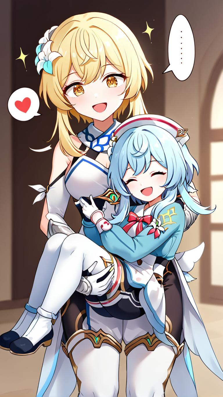 Prompt 2girls, happy, laughing,shoulder carry,speech bubble, sparkle, ...,spoken ellipsis, size difference, (lumine), carrying, sig3winne, official_costume, <lora:sigewinne:0.9>