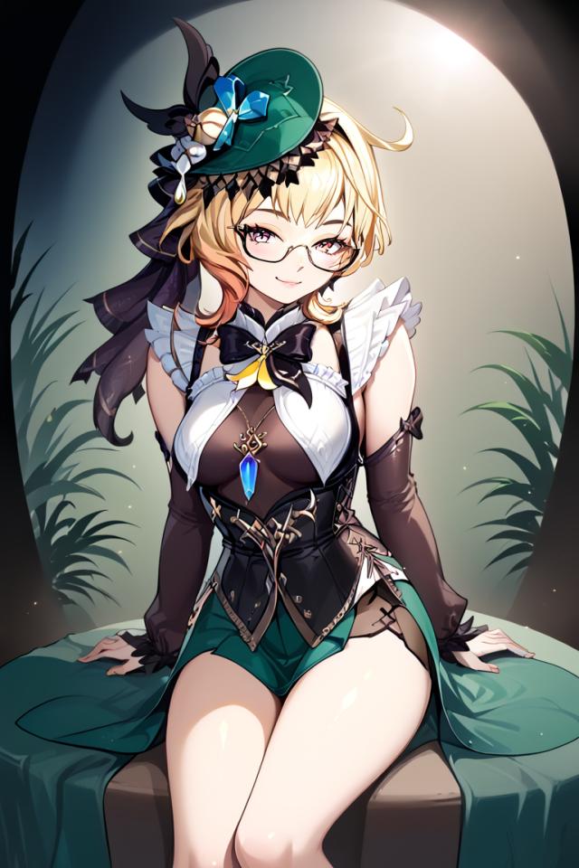 1girl, ahoge, bangs, black-framed eyewear, blonde hair, bow, bowtie, breasts, closed mouth, detached sleeves, dress, feet out of frame, frills, glasses, green headwear, green skirt, hairband, hat, jewelry, long sleeves, looking at viewer, medium breasts, mini hat, purple eyes, sitting, skirt, sleeveless, smile, solo, thighs, tilted headwear