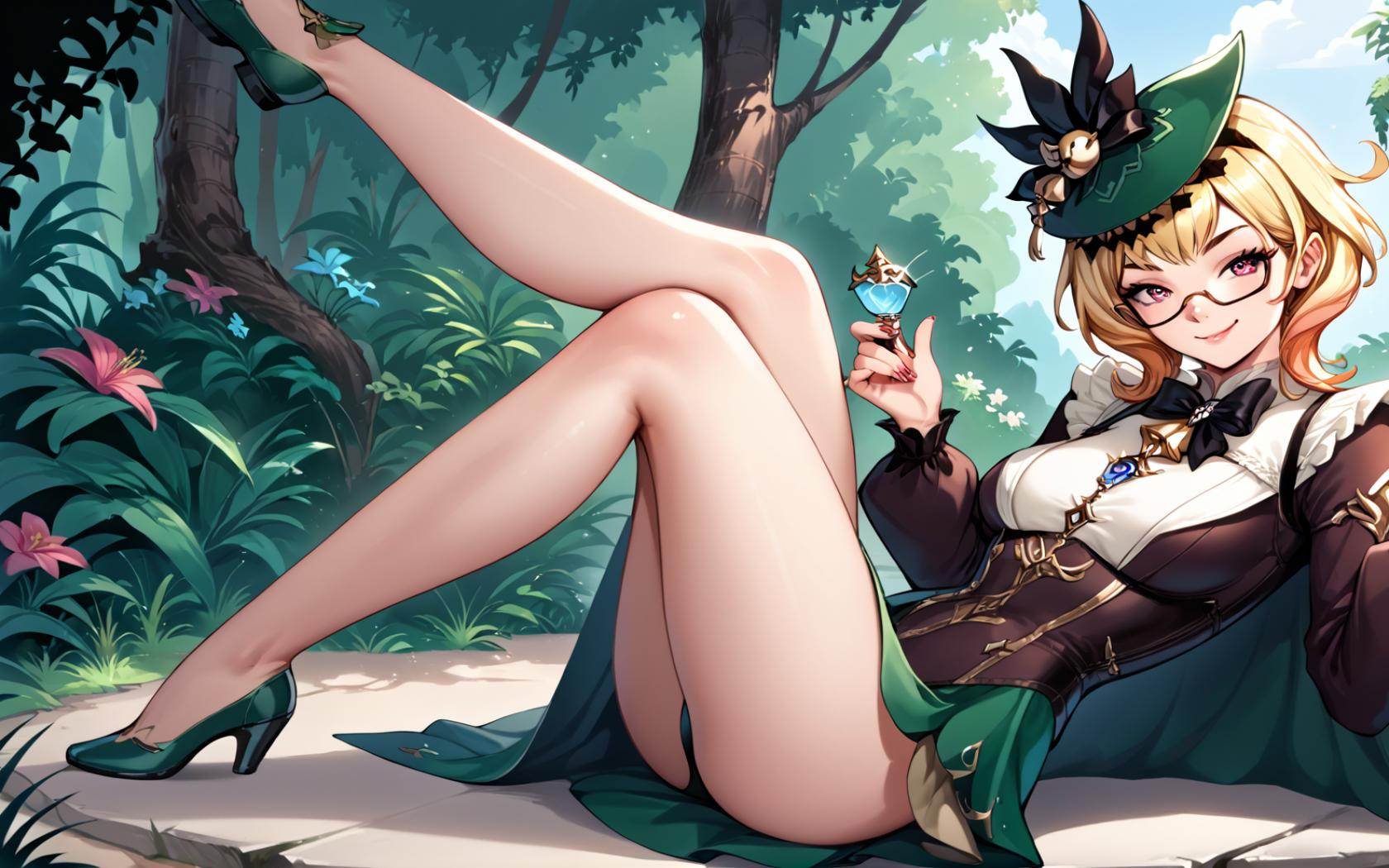 1girl, bangs, bare legs, blonde hair, bow, bowtie, breasts, cape, closed mouth, cup, day, flower, food, fruit, full body, glasses, green footwear , green headwear, hat, high heels, holding, holding cup, holding food, holding fruit, leg up, legs, long sleeves, looking at viewer, medium breasts, outdoors, short hair, sitting, smile, solo, tree