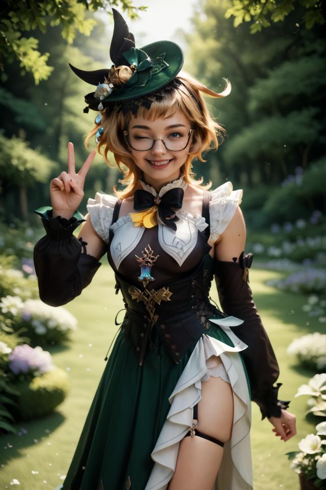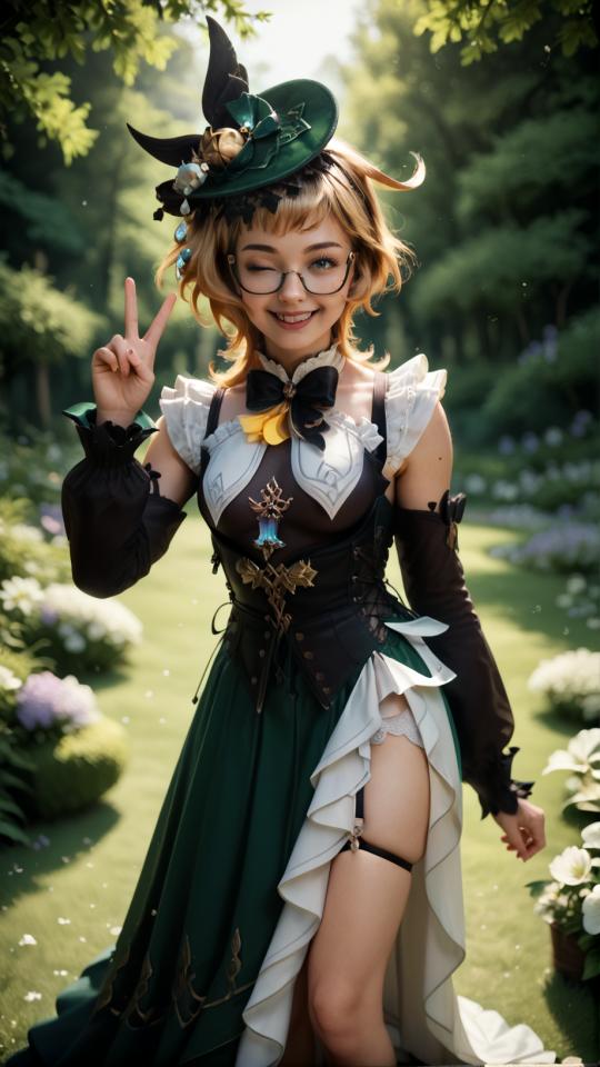 v, cute, smiling, happy, tongue out,one eye closed, forest background, flowers,