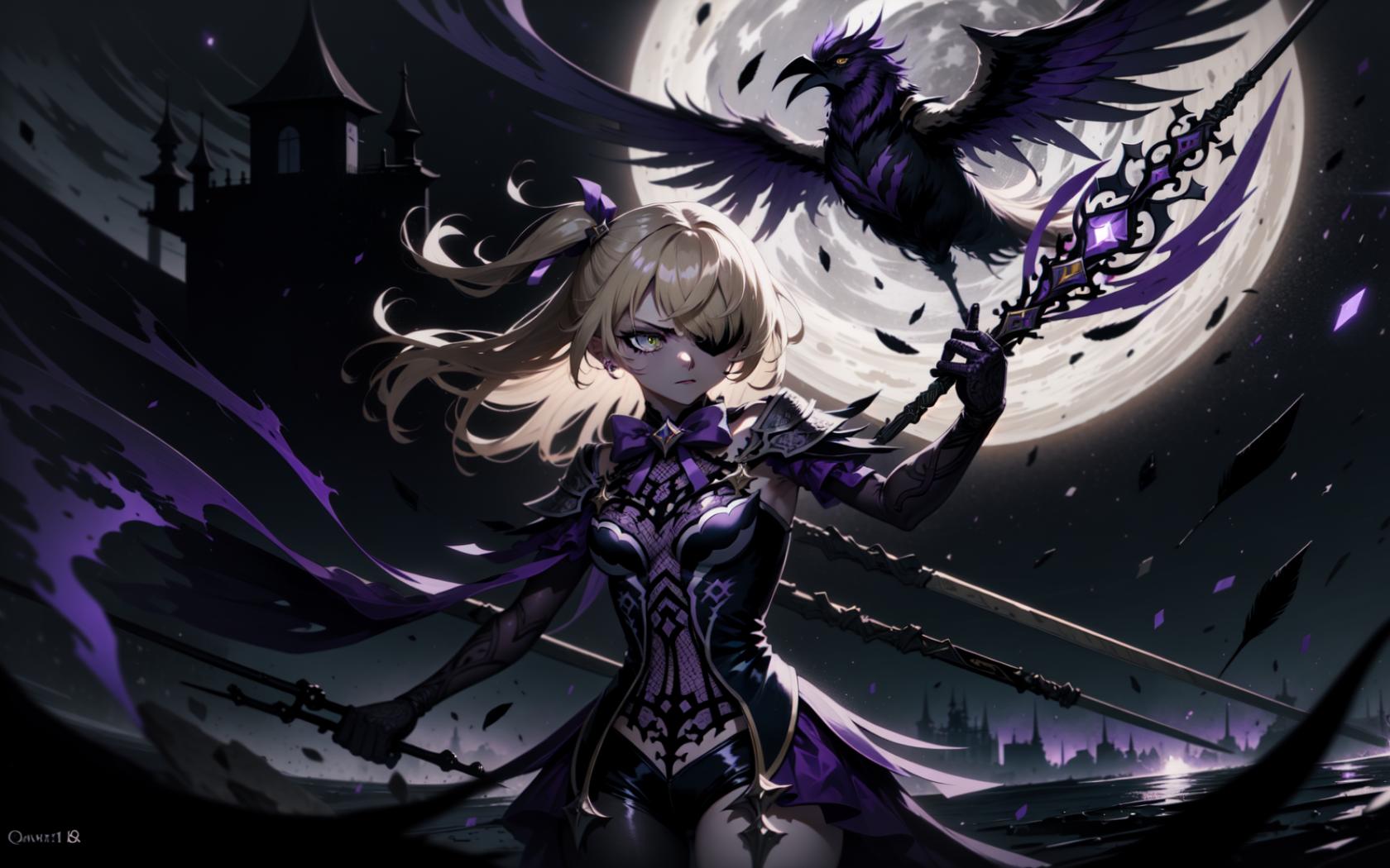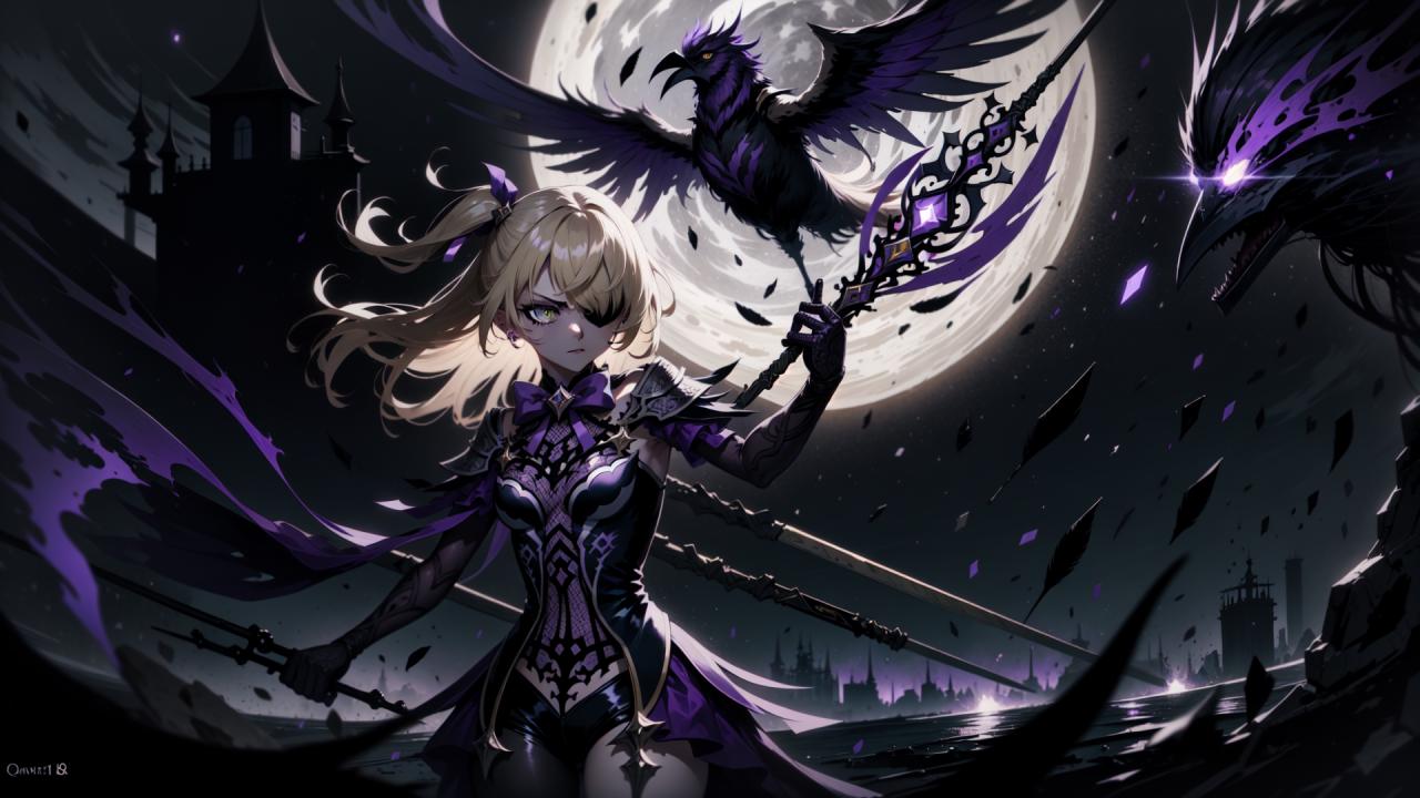| Prompt | (dramatic:1.3),(highly detailed:1.5), (realistic:1.05), ,(heroic:1.6), <lora:beautiful-eyes:0.7>, (epic:1.8, perfect artwork), best quality,sharp focus,(8k), (4k),(Masterpiece), (Best Quality), fantasy, extremely detailed, intricate, hyper detailed, (perfect face), illustration,soft lighting, Ultra detailed fantasy environment, clearly worked out detail, intricate, cinematic,(depth of field), ( dramatic lighting:1.2), <lora:fischl1:1>fischldef,,1girl, solo,very long blonde hair,,((black stockings)), night, thunder, lightnings, wind, dark clouds, maelstrom, (end of the world), outdoors, ((((wind, full moon)))), (medieval black castle background, crow, crows, crow feathers in the wind:1.2), (angry:1.2), agressive, (purple quiver, black arrows,drawing purple bow:1.4), (looking at viewer:1.7), <lora:kVoidEnergy:0.7>,purple V0id3nergy, |