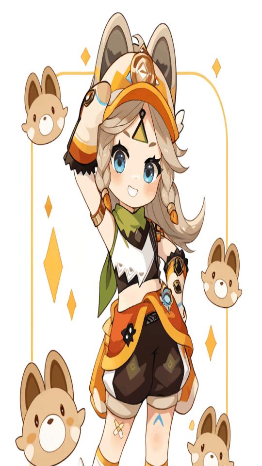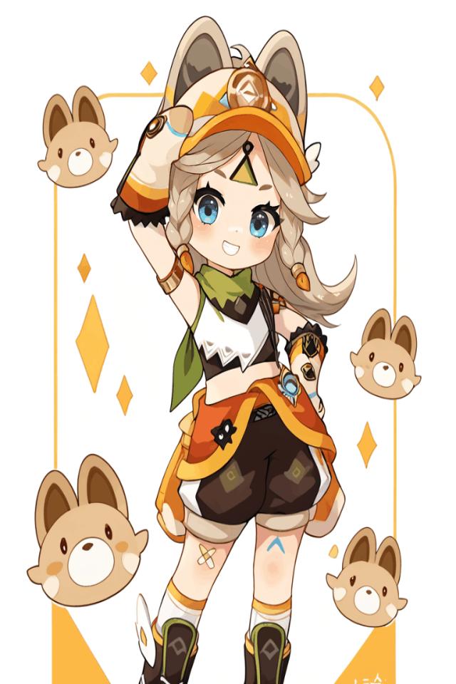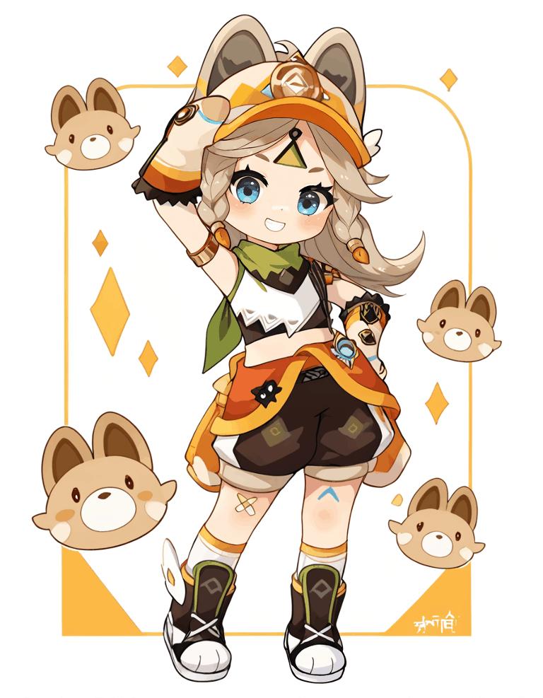 Prompt score_9, score_8_up, score_7_up, rating_safe, kachina, solo, looking at viewer, blush, smile, tail, full body, chibi, grin, arm up, hand on hip, pokemon \(creature\), <lora:kachina:0.9>