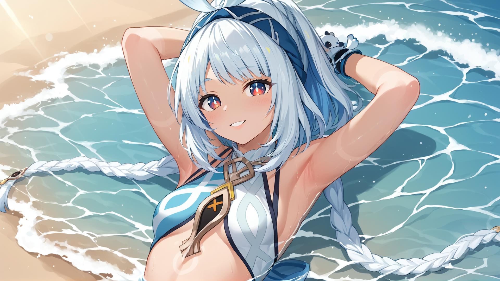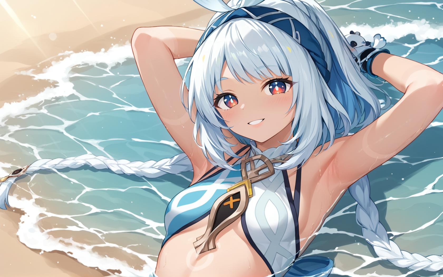 | Prompt | score_9, score_8_up, score_7_up, mualani, official_costume, lying on shore,sand, smiling, hands behind the head, looking at sky, sun, sunrays, water, waves, <lora:mualani:1> |