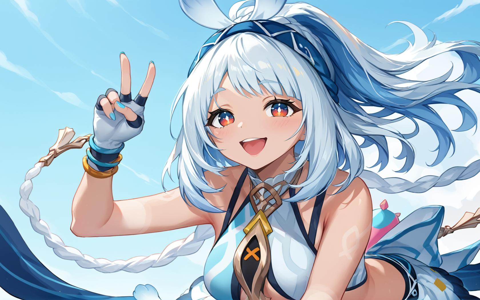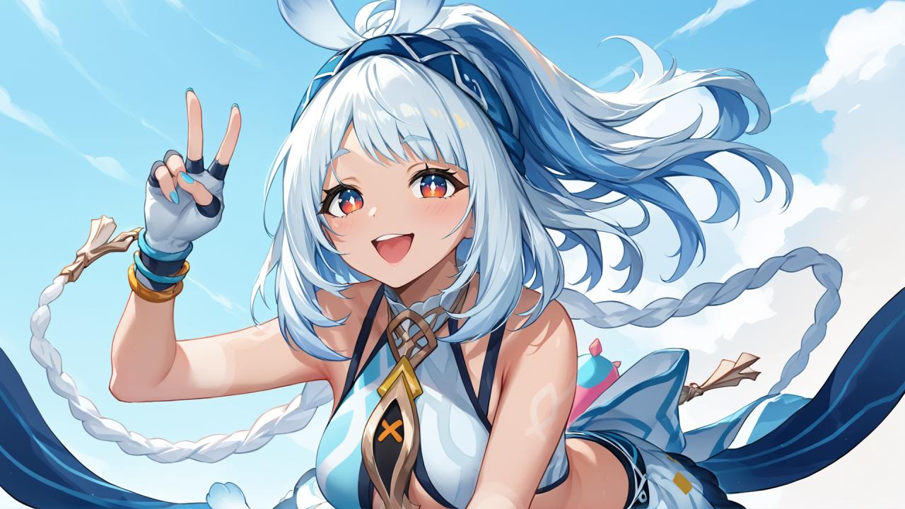 | Prompt | score_9, score_8_up, score_7_up, mualani, official_costume, v, happy, huge smile, <lora:mualani:1> |