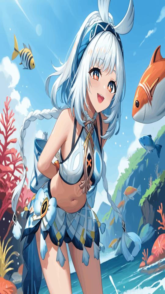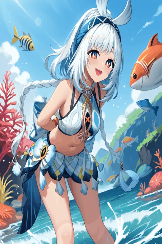 | Prompt | score_9, score_8_up, score_7_up, mualani, official_costume, leaning forward, happy, huge smile, creature, fish, blue fishes,coral,seashells, waves, raging sea, hands behind back, <lora:mualani:1> |