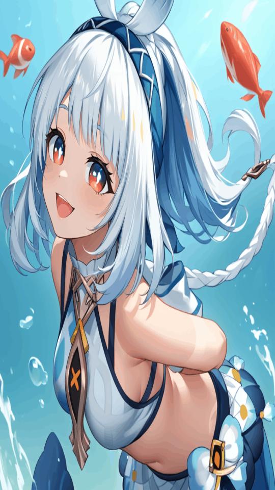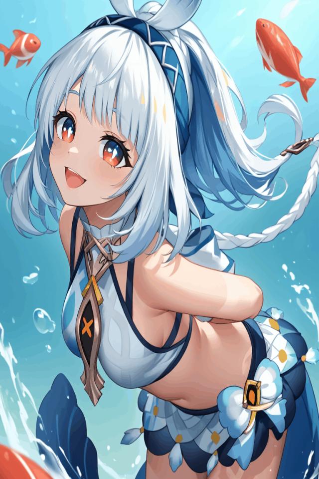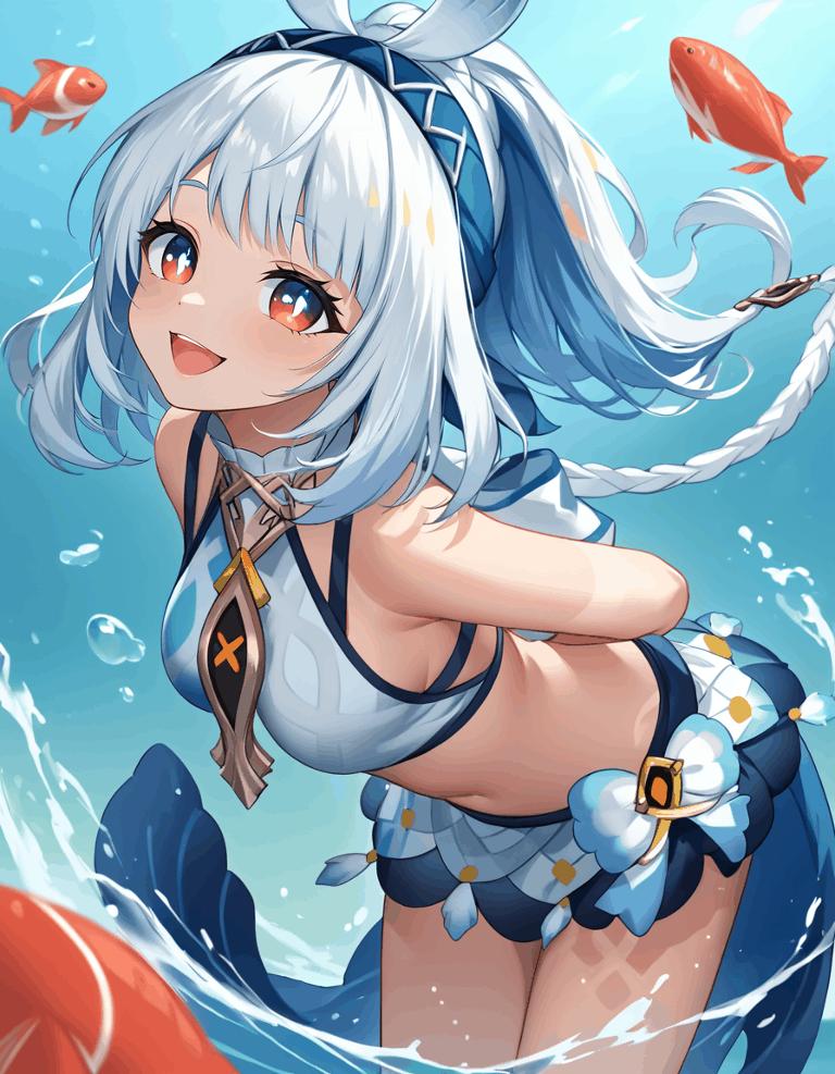 Prompt score_9, score_8_up, score_7_up, mualani, official_costume, leaning forward, happy, huge smile, creature, fish, blue fishes,coral,seashells, waves, raging sea, hands behind back, <lora:mualani:1>
