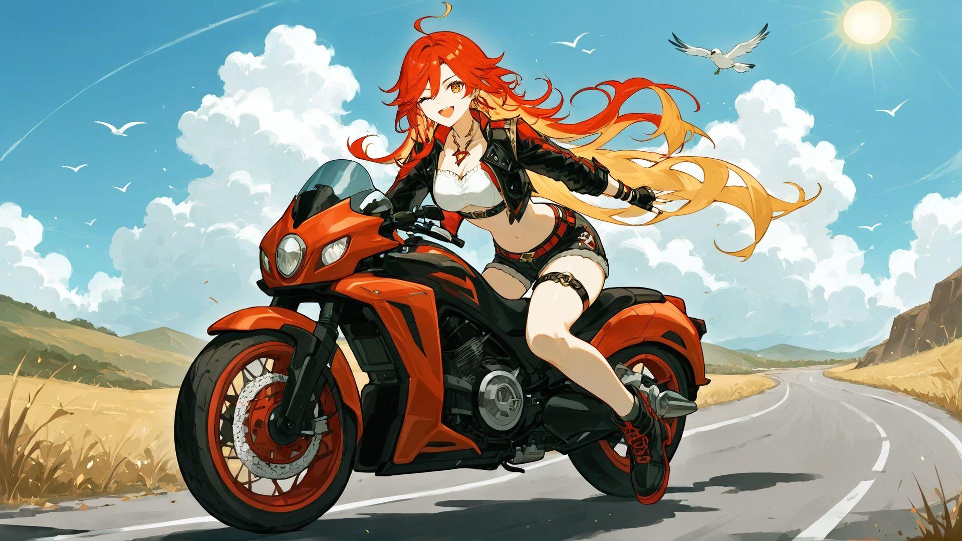 1girl, ;d, ahoge, belt, bird, black footwear, black gloves, black jacket, black shorts, blue sky, boots, breasts, cleavage, cloud, crop top, cropped jacket, day, fingerless gloves, full body, gloves, ground vehicle, jacket, jewelry, long hair, looking at viewer, medium breasts, midriff, motor vehicle, motorcycle , multicolored hair, navel, necklace, one eye closed, open clothes, open jacket, open mouth, orange eyes, orange hair, outdoors, red hair, riding, shoes, short shorts, shorts, sky, smile, sneakers, solo, sun, thigh strap, very long hair, virtual youtuber, yellow eyes