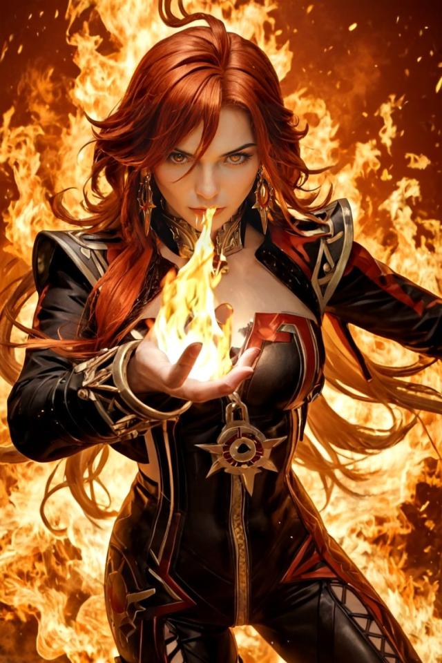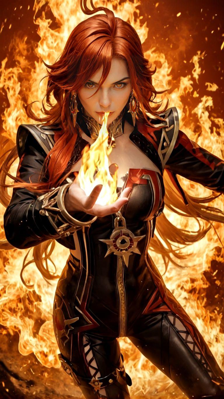 Prompt score_9, score_8_up, score_7_up, source_photo, realistic, mavuika, official_costume, heroic pose, fire background, flames, heroic fantasy, epic, <lora:mavuika:0.8>