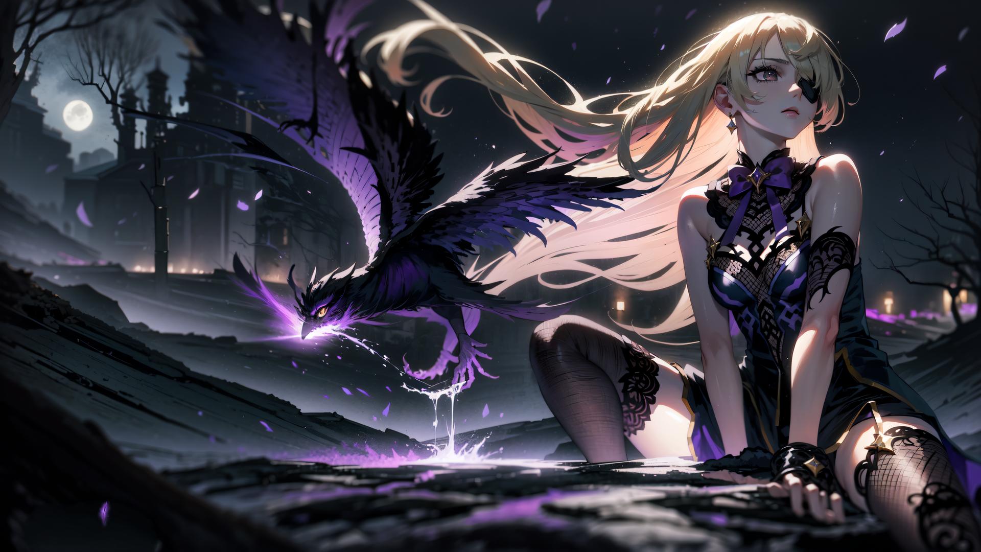 1girl, arm garter, bangs, bare shoulders, bare tree, bat (animal), bird, black dress, black gloves, black thighhighs, blonde hair, bow, castle, closed mouth, cross, crow, dragon, dress, earrings, eyepatch, fingerless gloves, fishnets, floating hair, full moon, garter straps, gloves, hair over one eye, jewelry, lace trim, lace-trimmed legwear, long hair, looking away, medium breasts, moon, moonlight , night, night sky, outdoors, petals, sitting, sky, sleeveless, sleeveless dress, solo, thighhighs, tree, very long hair, water