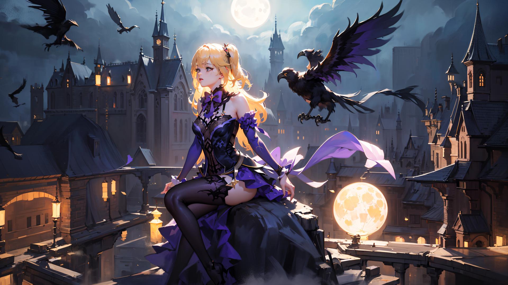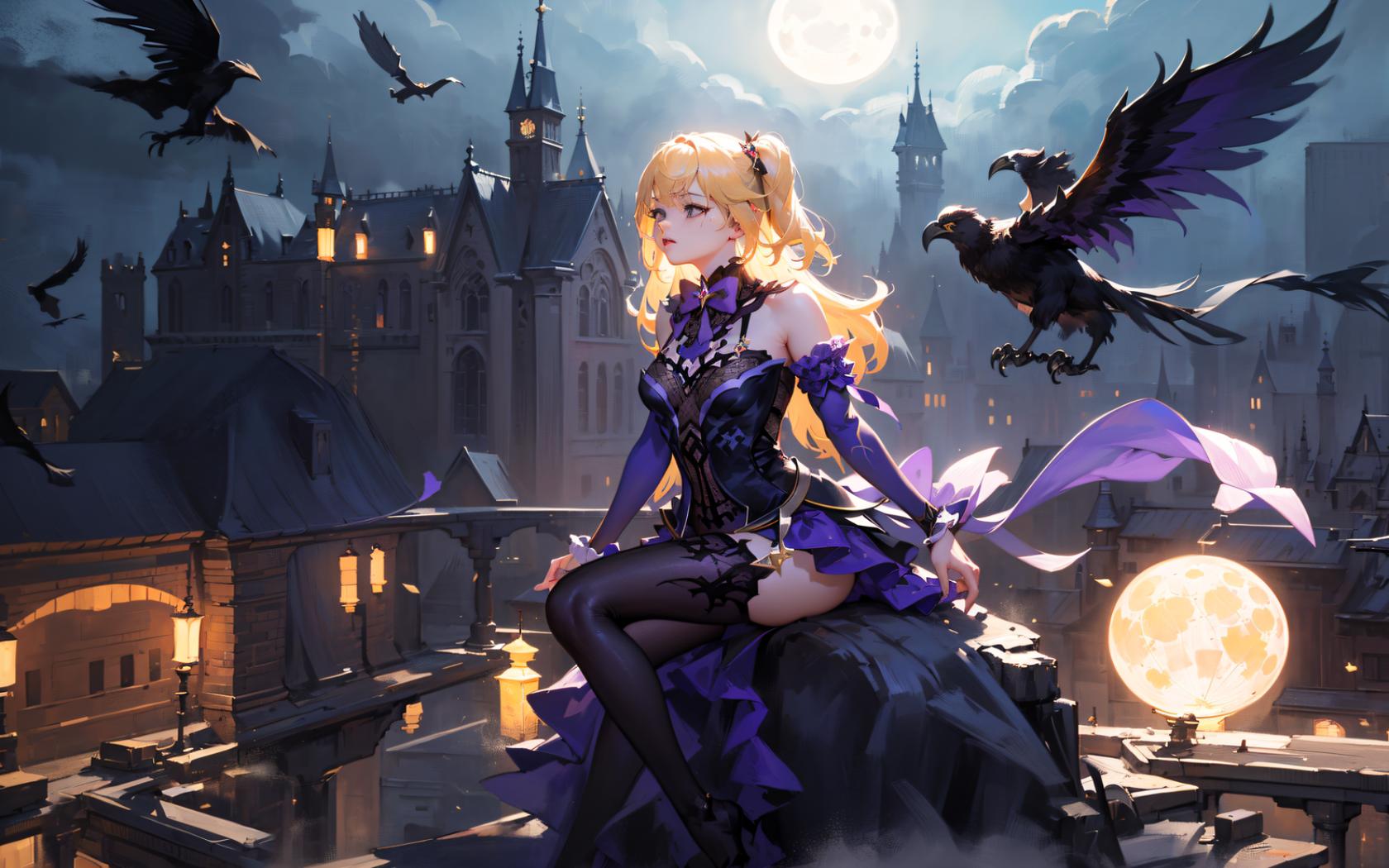 1girl, bangs, bare shoulders, bird, black dress, black thighhighs, blonde hair, bow, bowtie, building, castle, cloud, cloudy sky, crow , detached sleeves, dress, eyepatch, full moon, garter straps, high heels, long hair, moon, night, night sky, open mouth, outdoors, purple bow, purple dress, red eyes, sitting, sky, solo, thighhighs, two side up