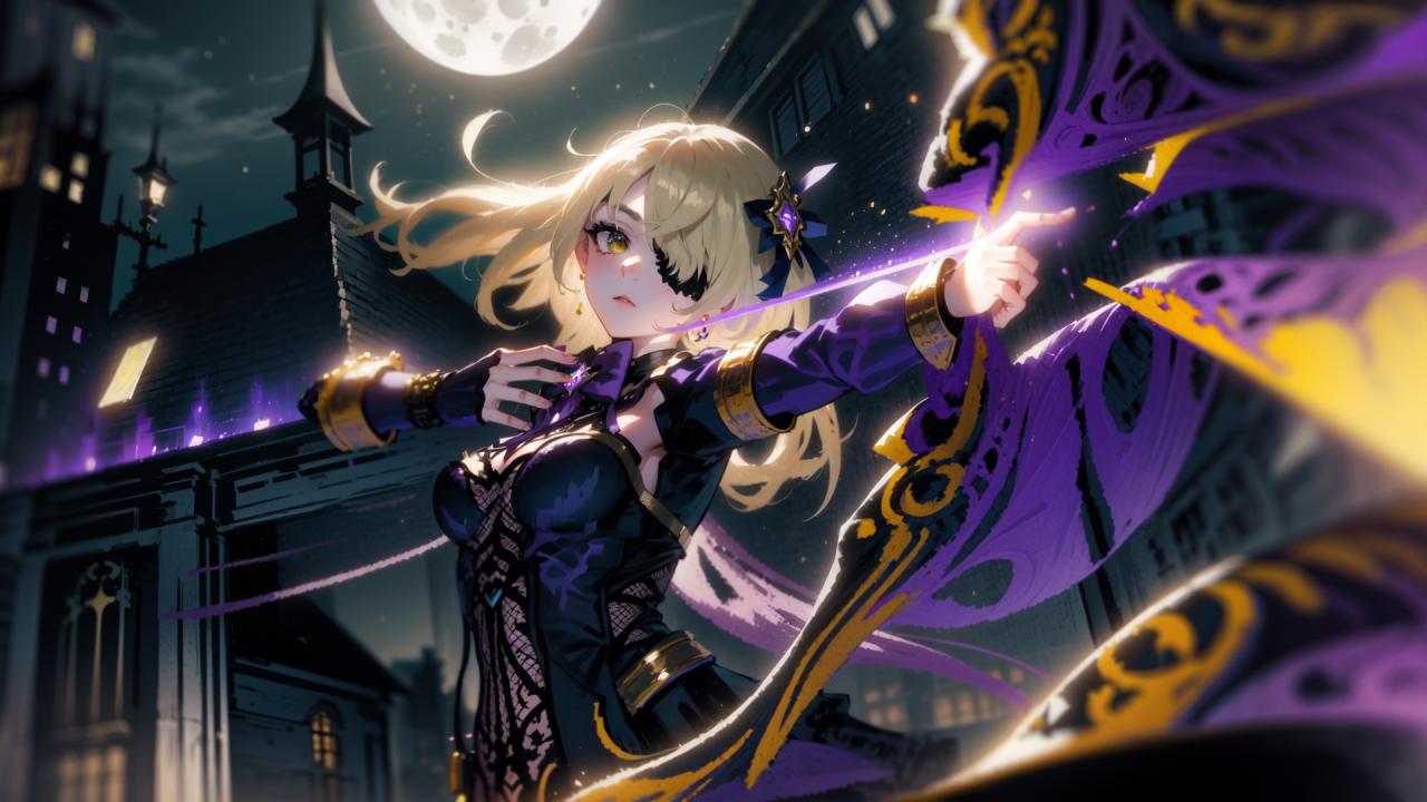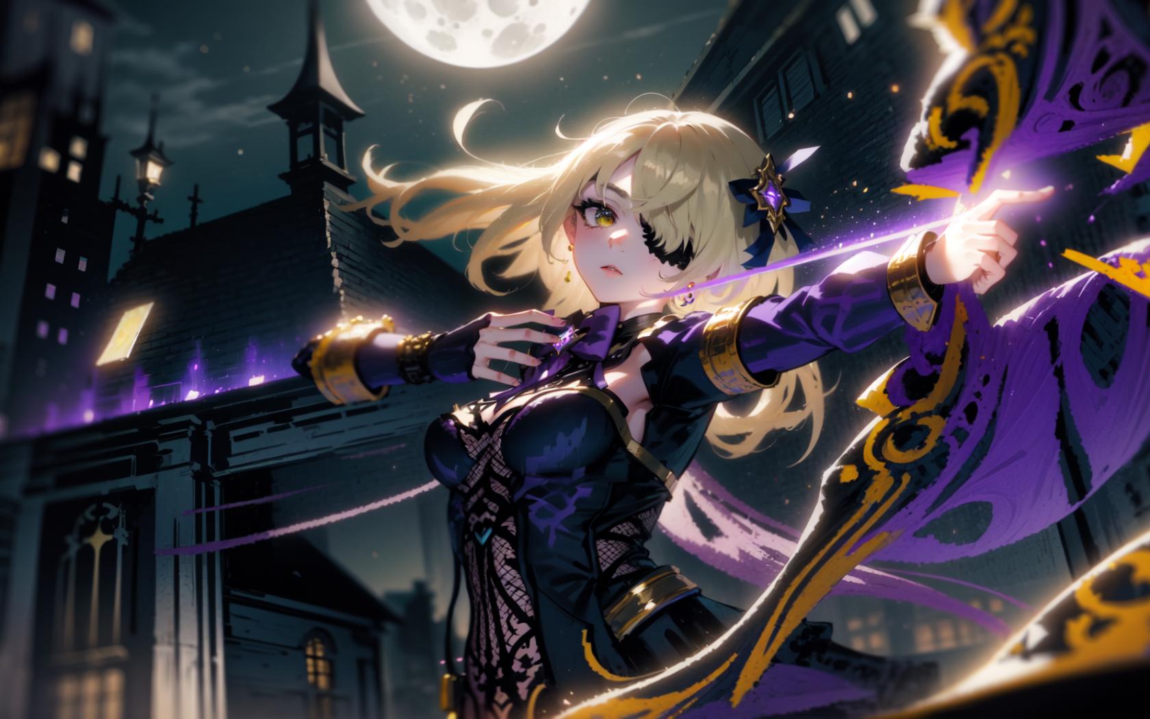 1girl, alternate costume, arrow (projectile), bangs, black dress, blonde hair, blurry, bow, bow (weapon), bowtie, building, castle , closed mouth, dress, earrings, eyepatch, floating hair, full moon, green eyes, hair ornament, hair over one eye, holding, holding bow (weapon), holding weapon, jewelry, long hair, long sleeves, looking at viewer, medium breasts, moon, nail polish, night, night sky, official alternate costume, one eye covered, outdoors, outstretched arm, purple bow, purple bowtie, sky, solo, upper body, weapon, yellow eyes