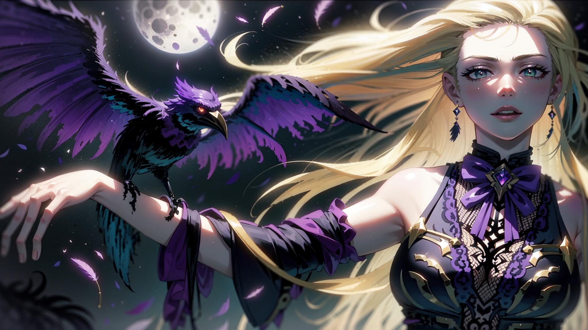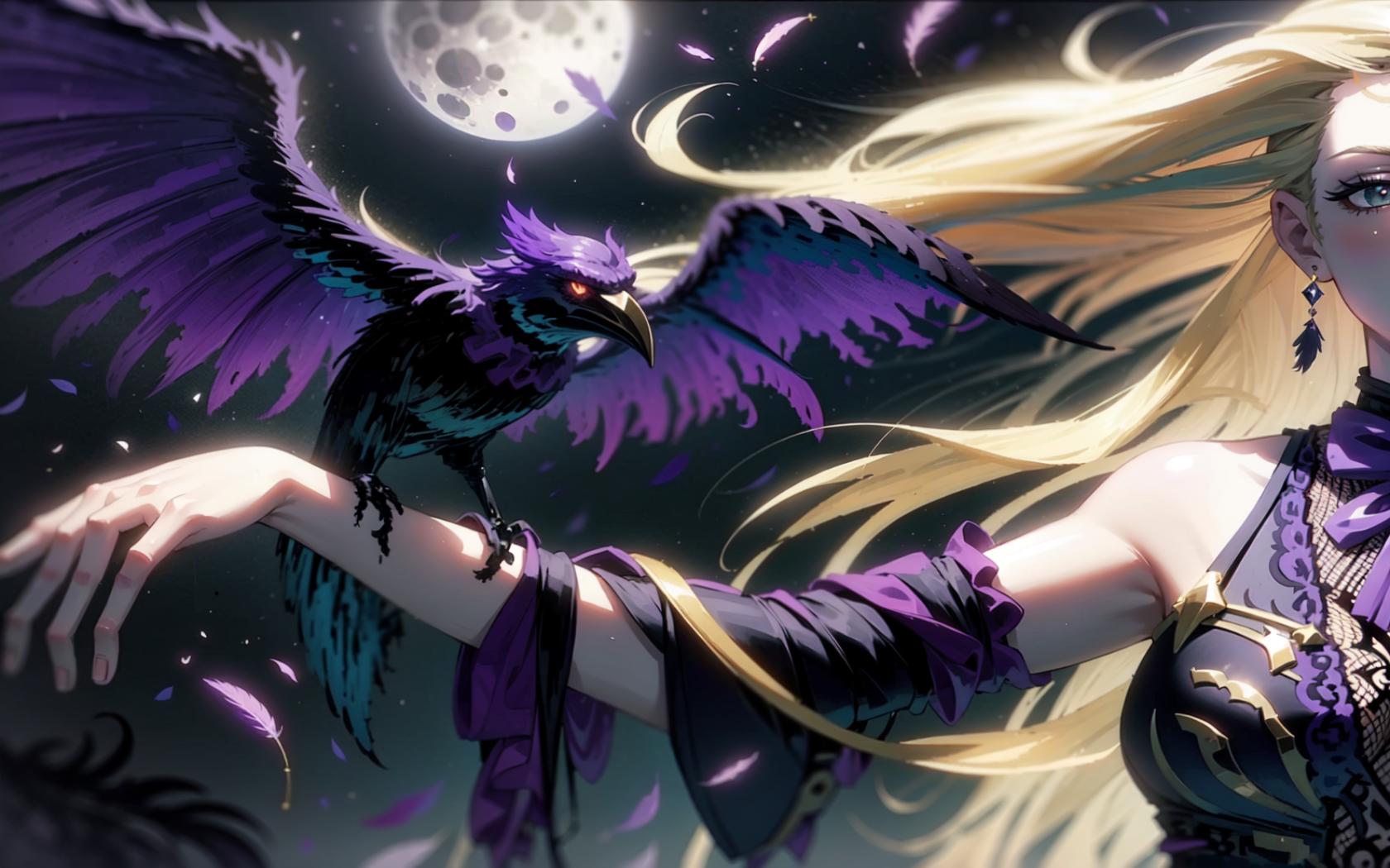 | Prompt | (dramatic:1.2),(highly detailed:1.8), (realistic:1.35) ,(heroic:1.2), (romantic:1.6), <lora:beautiful-eyes:0.7>, (epic:1.2, perfect artwork), best quality,sharp focus,(8k), (4k),(Masterpiece), (Best Quality), fantasy, extremely detailed, intricate, hyper detailed, (perfect face), illustration,soft lighting, Ultra detailed fantasy environment, clearly worked out detail, intricate, cinematic,(depth of field), ( dramatic lighting:1.2), <lora:fischl1:1>fischldef,,1girl, solo,very long blonde hair,,((black stockings)), black eyepatch, night, thunder, lightnings, wind, dark clouds, maelstrom, (end of the world), outdoors, ((((wind, full moon, crow feathers in the wind)))), (glowing crow on arm, galaxy background:1.2), (sexy:1.1, serious, focused), <lora:kVoidEnergy:0.6>,purple V0id3nergy, |