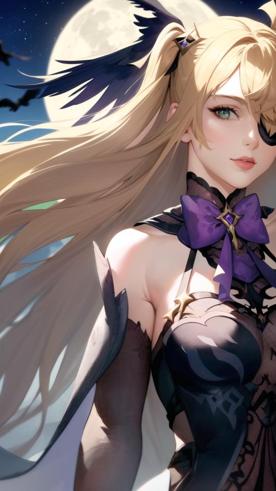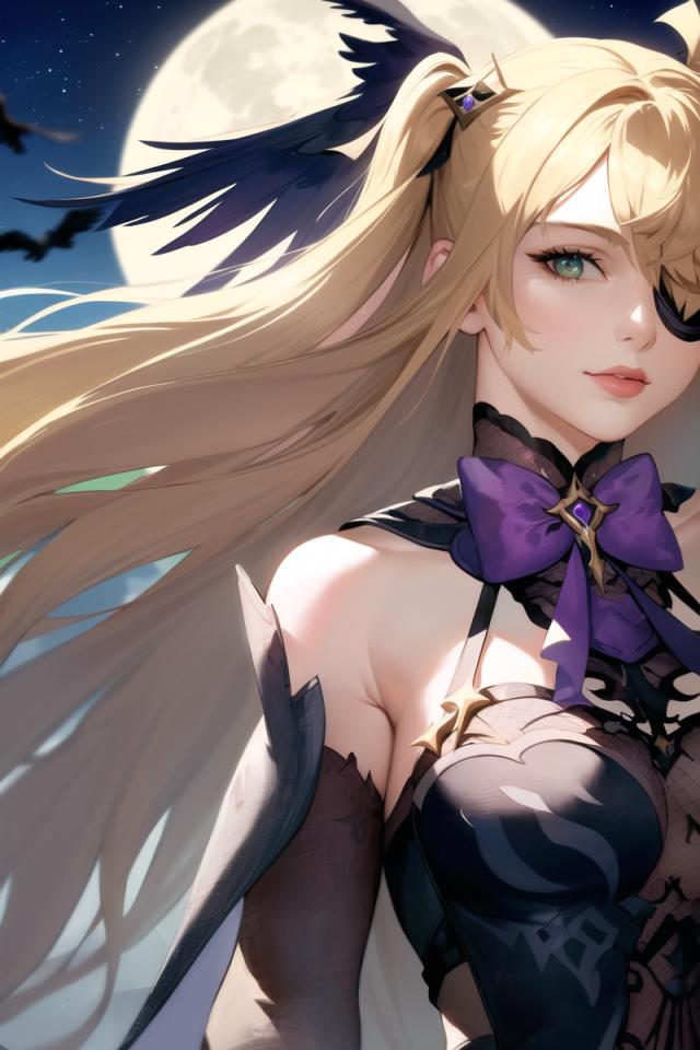 | Prompt | (dramatic:1.1),(highly detailed:1.5), (realistic:1.15),(romantic:1.1),(heroic:1.1), (epic:1.2, perfect artwork), best quality,sharp focus,(8k), (4k),(Masterpiece), (Best Quality), fantasy, extremely detailed, intricate, hyper detailed, (perfect face), illustration,soft lighting, Ultra detailed fantasy environment, clearly worked out detail, intricate, cinematic,(depth of field), (soft lighting), <lora:fischl1:1>fischldef,1girl, solo,very long blonde hair,(stockings)), (black eyepatch, adult, mature, motherly), (((night))), outdoors, (wind, full moon, crow feathers in the wind), (black crows, white medieval castle background:1.4), (sexy:1.2, wink smile, looking at viewer), |