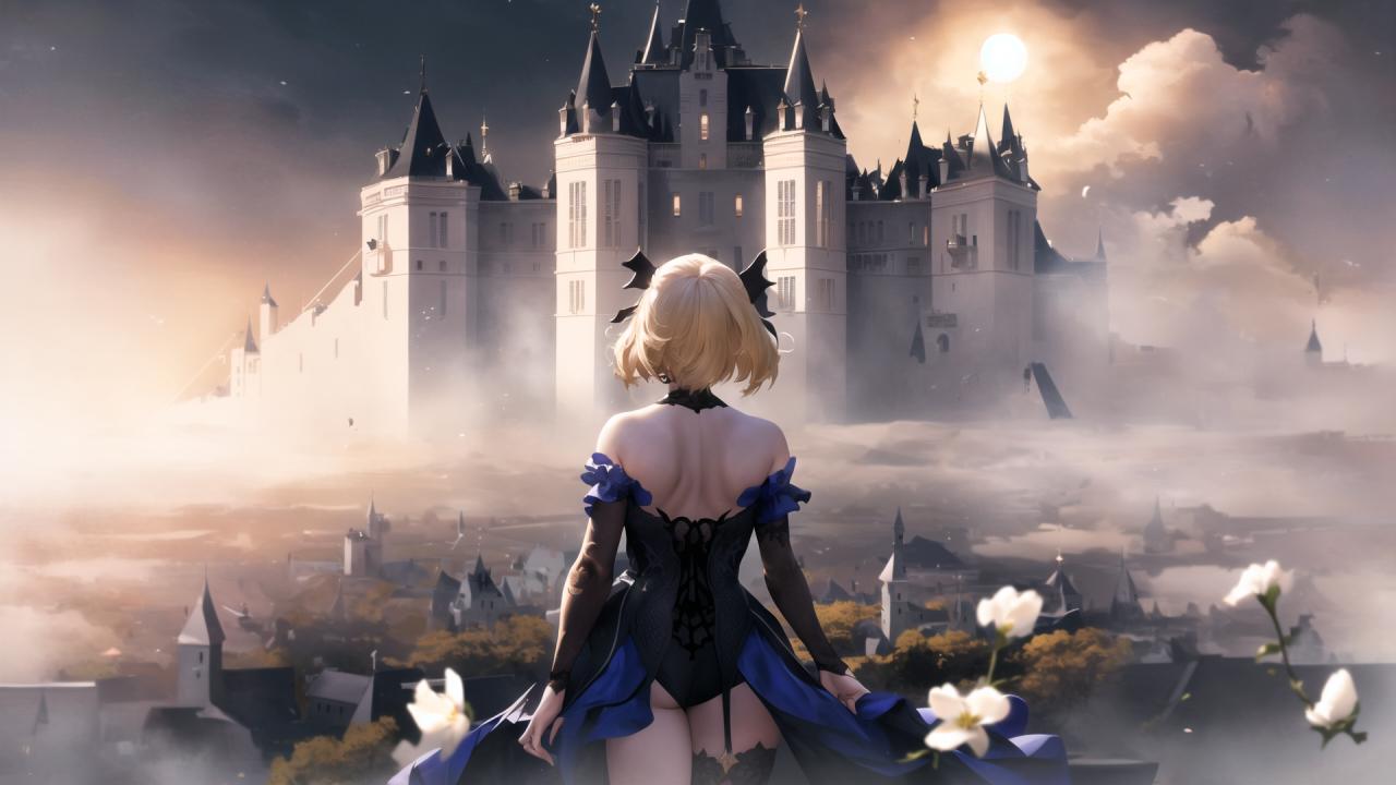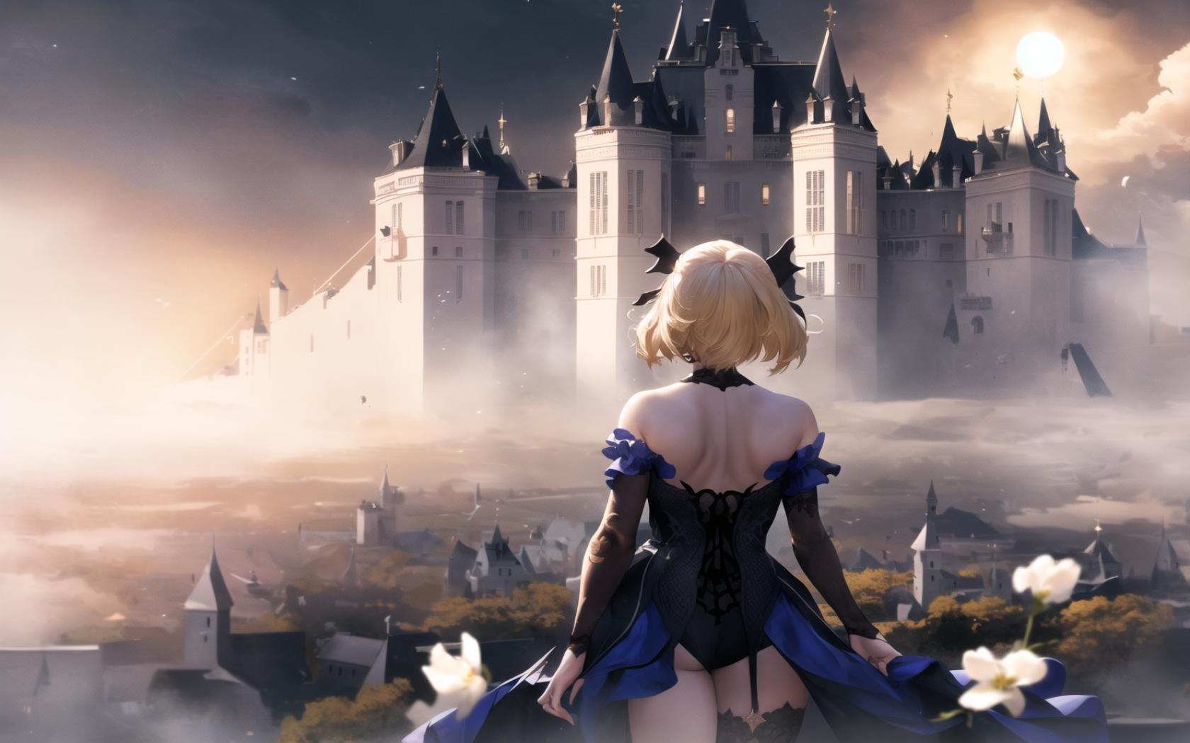 | Prompt | (dramatic:1.1),(highly detailed:1.5), (realistic:1.45),(romantic:1.1),(heroic:1.1), (epic:1.2, perfect artwork), best quality,sharp focus,(8k), (4k),(Masterpiece), (Best Quality), fantasy, extremely detailed, intricate, hyper detailed, (perfect face), illustration,soft lighting, Ultra detailed fantasy environment, clearly worked out detail, intricate, cinematic,(depth of field), (soft lighting), <lora:fischl1:1>fischldef,1girl, solo,very long blonde hair,(stockings)), (black eyepatch, adult, mature, motherly), (((sunset))), mist, outdoors, (wind, full moon, white clouds, white flowers), ( white medieval castle background:1.4), (sexy:1.2, light smile), |