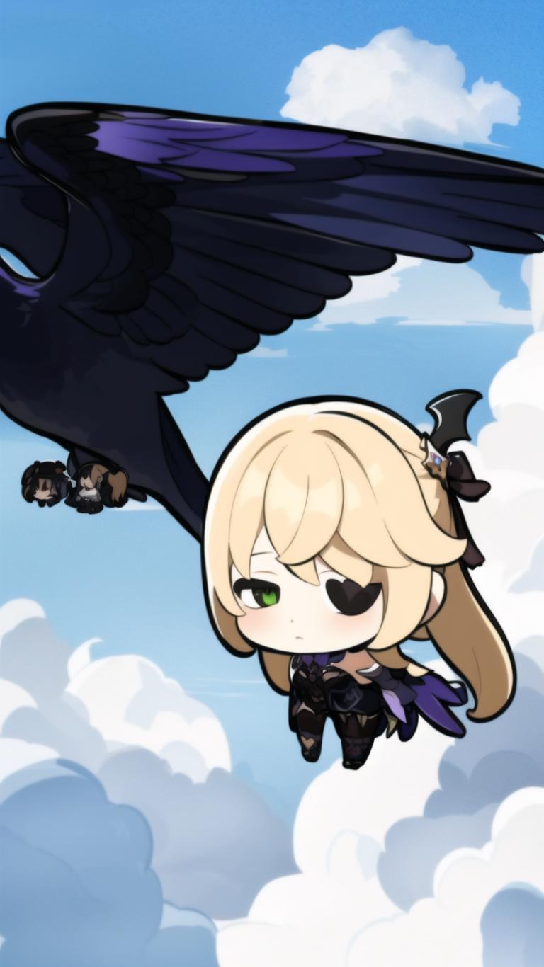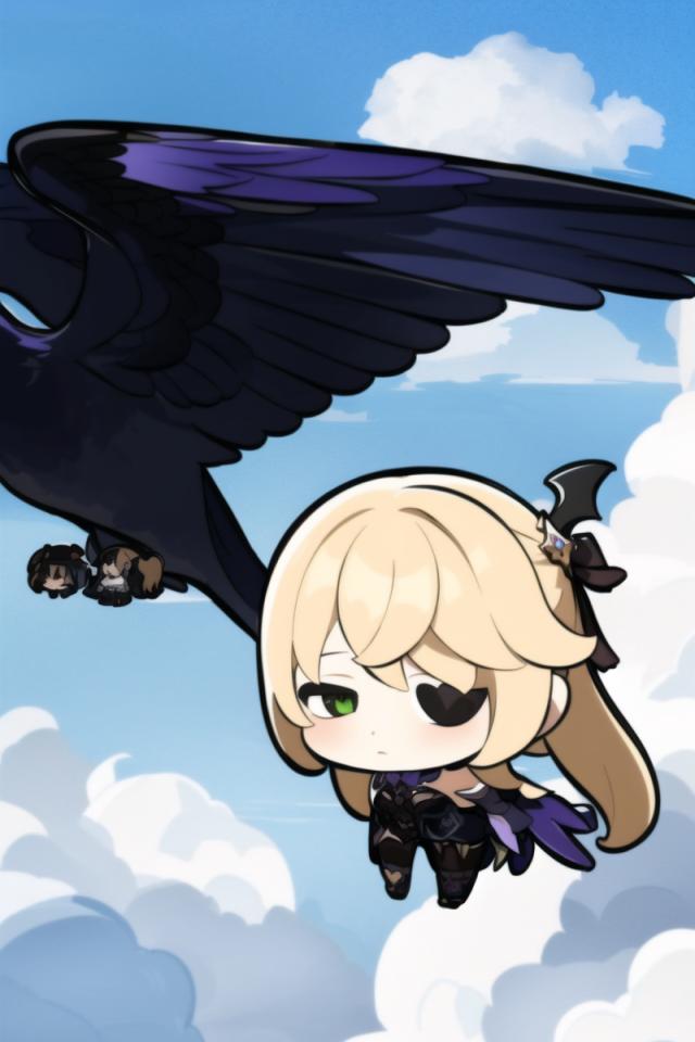 | Prompt | (dramatic:1.1),(highly detailed:1.5), (realistic:1.45),(romantic:1.1),(heroic:1.1), (epic:1.2, perfect artwork), best quality,sharp focus,(8k), (4k),(Masterpiece), (Best Quality), fantasy, extremely detailed, intricate, hyper detailed, (perfect face), illustration,soft lighting, Ultra detailed fantasy environment, clearly worked out detail, intricate, cinematic,(depth of field), (soft lighting), <lora:fischl1:1>fischldef,1girl, solo,very long blonde hair,(stockings)), (black eyepatch, adult, mature, motherly), outdoors, (day, sunny day, white clouds), white castle background, flowers,rainbow, ((flying with crow)), (happy), <lora:GenshinStickers:1>(chibi style:1.8), |