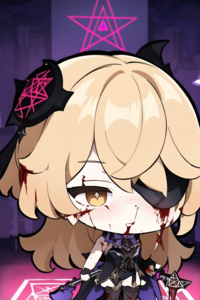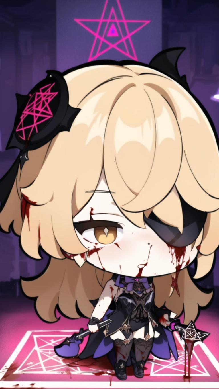 | Prompt | (dramatic:1.1),(highly detailed:1.5), (horror:1.45),(romantic:1.1),(heroic:1.1), (epic:1.2, perfect artwork), best quality,sharp focus,(8k), (4k),(Masterpiece), (Best Quality), fantasy, extremely detailed, intricate, hyper detailed, (perfect face), illustration,soft lighting, Ultra detailed fantasy environment, clearly worked out detail, intricate, cinematic,(depth of field), (soft lighting), <lora:fischl1:1>fischldef,1girl, solo,very long blonde hair,(stockings)), (black eyepatch, adult, mature, motherly), indoors, torture chamber, chains, dark atmosphere, ((((((performing dark sacrament, holding sacrificial dagger, blood, pentagram)))))), (angry, crazy), <lora:GenshinStickers:1>(chibi style:1.8), |