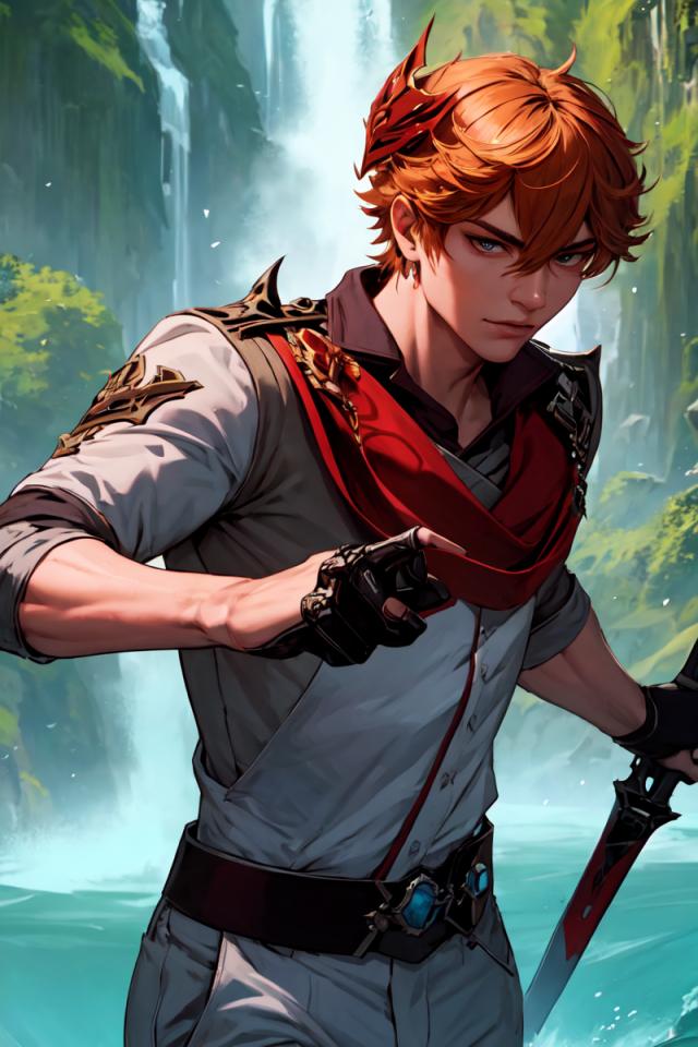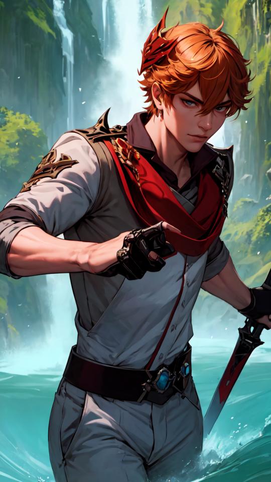 1boy, bangs, belt, black gloves, blue eyes, closed mouth, earrings, gloves, grey jacket, grey pants, hair between eyes, half gloves, holding, holding weapon, jacket, jewelry, looking at viewer, male focus, mask, mask on head, orange hair, outdoors, pants, red mask , red scarf, scarf, shirt, short hair, single earring, sleeves rolled up, solo, standing, vision (genshin impact), wading, water, waterfall, weapon