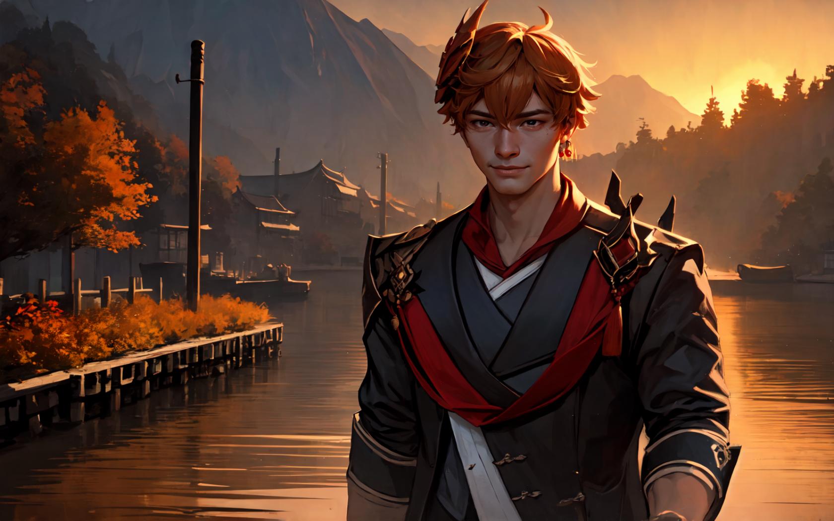 1boy, ahoge, architecture, bangs, blue eyes, bridge, closed mouth, earrings, east asian architecture, hair between eyes, jacket, japanese clothes, jewelry, looking at viewer, male focus, mask, mask on head, mountain, orange hair, outdoors, red mask , red scarf, scarf, short hair, single earring, smile, solo, sunset, tree, upper body, water