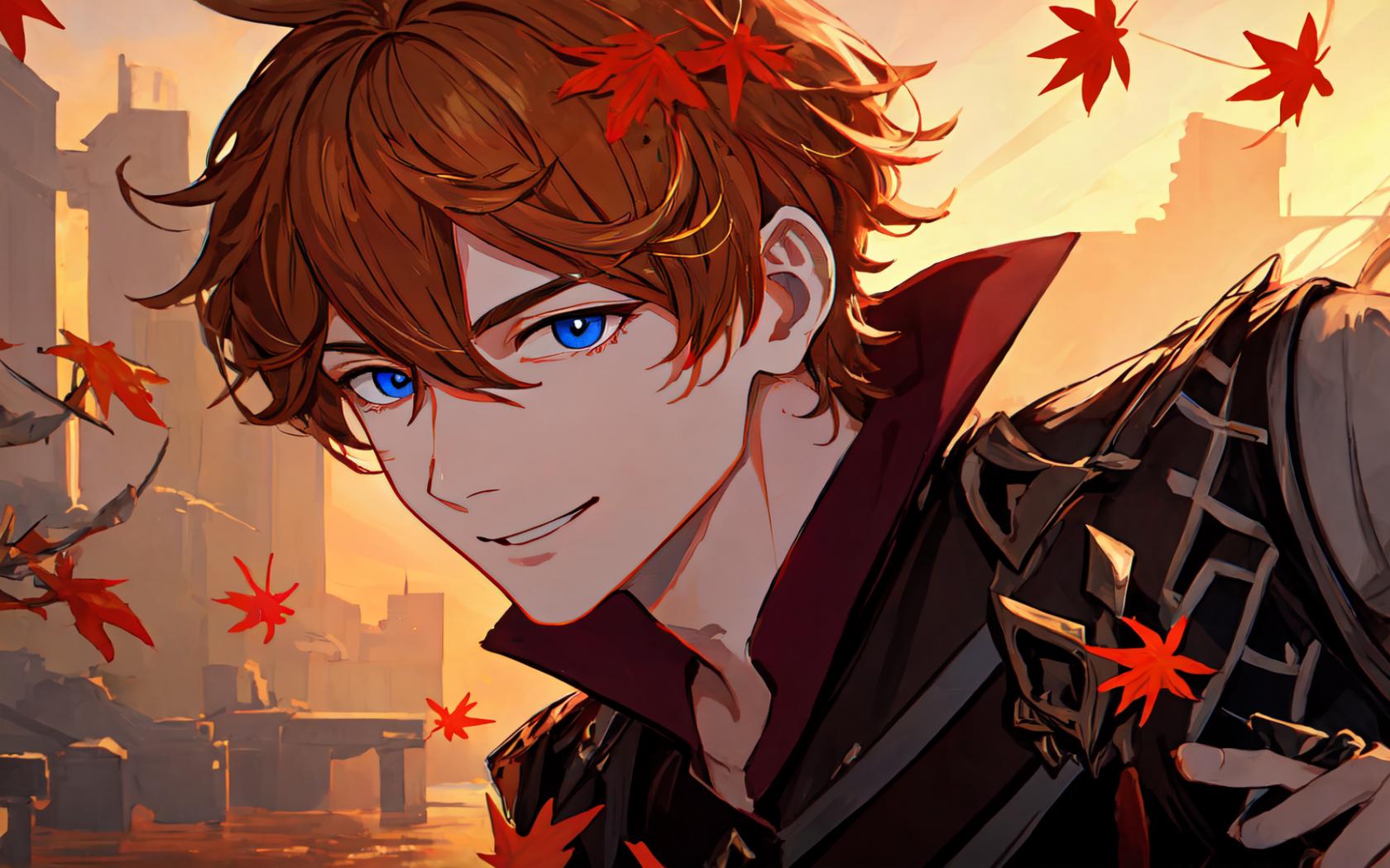sunset, fall, maple leaves in the wind, festival, fireworks,