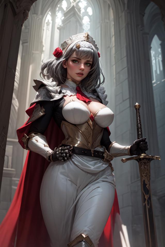 1girl, armor, ascot, bangs, belt, braid, cape, cleavage, flower, gauntlets, green eyes, grey hair, hair flower, hair ornament, hand on hip, holding, holding sword, holding weapon, indoors, large breasts, looking at viewer, maid, maid headdress, pauldrons, red flower, red rose , rose, short hair, shoulder armor, solo, sword, weapon