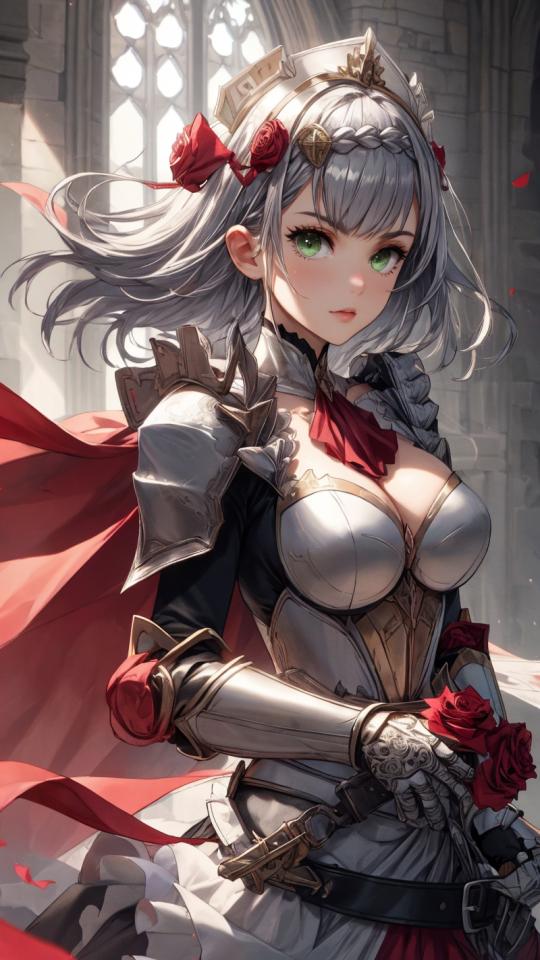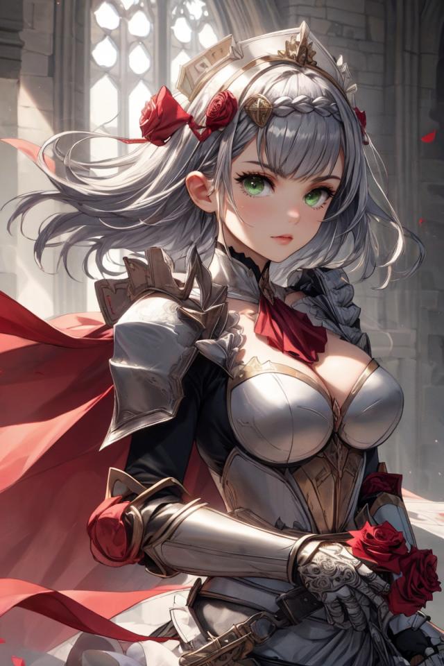 1girl, apron, armor, armored dress, ascot, bangs, braid, cape, cleavage, closed mouth, dress, flower, gauntlets, green eyes, grey hair, hair flower, hair ornament, holding, holding flower, large breasts, looking at viewer, maid headdress, medium breasts, pauldrons, petals, red ascot , red flower, red rose, rose, short hair, shoulder armor, solo, sword, weapon