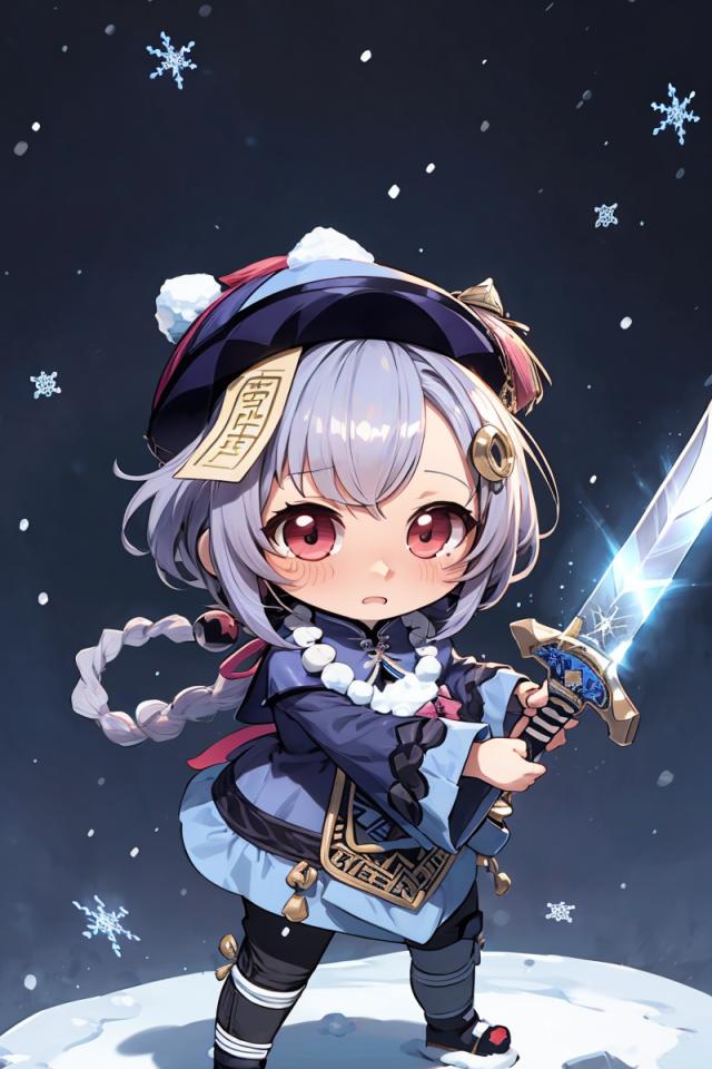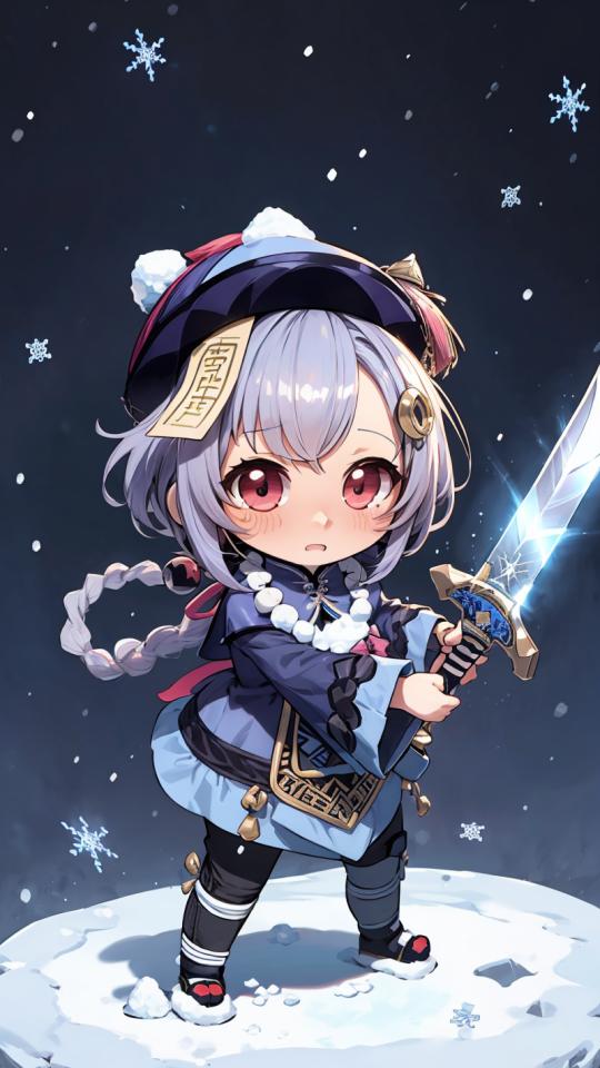 1girl, bangs, bead necklace, beads, blush, braid, braided ponytail, chibi, coin hair ornament , dress, full body, hair ornament, hat, holding, holding sword, holding weapon, jewelry, jiangshi, long hair, long sleeves, looking at viewer, necklace, ofuda, open mouth, parted lips, purple hair, qing guanmao, red eyes, single braid, snow, snowflakes, snowing, solo, standing, sword, weapon, wide sleeves
