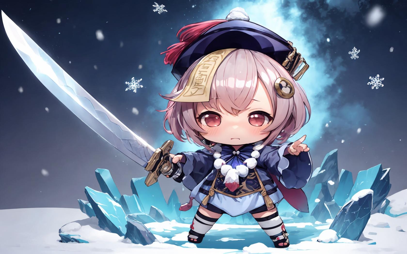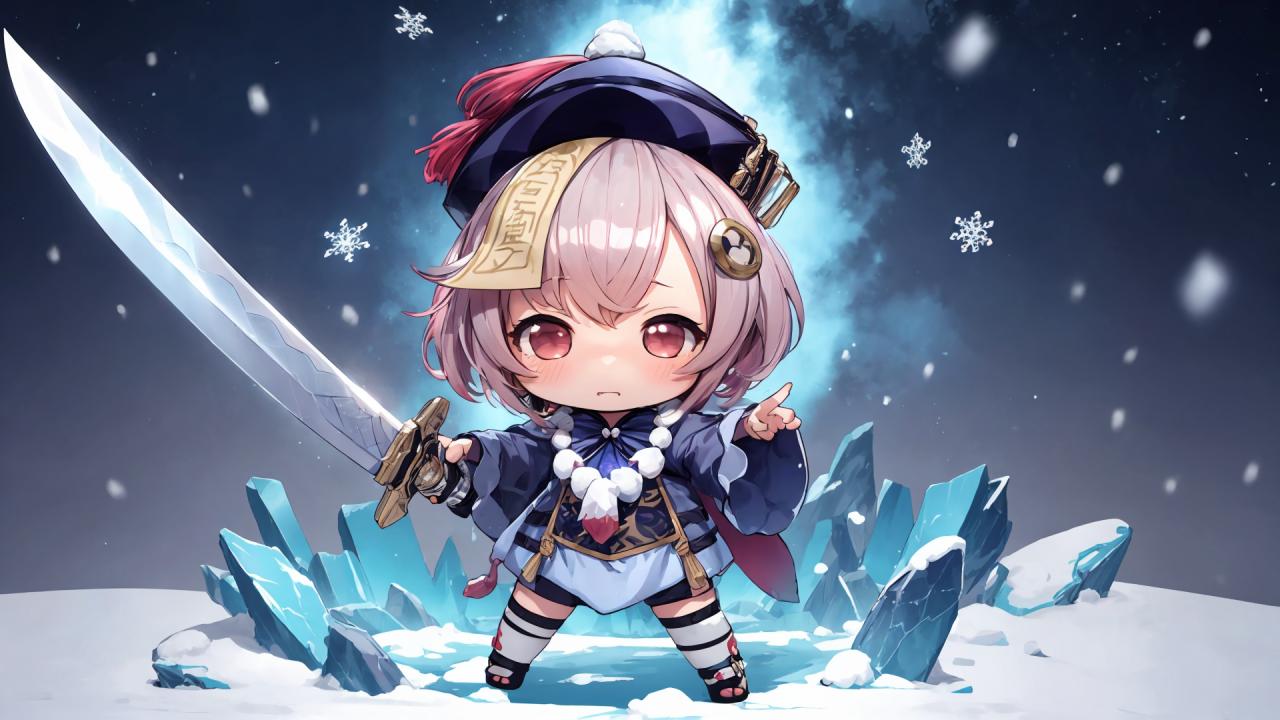 1girl, bandaged leg, bangs, blush, braid, chibi, closed mouth, coin hair ornament , dress, full body, hair between eyes, hair ornament, hat, holding, holding sword, holding weapon, ice, jewelry, long sleeves, looking at viewer, ofuda, purple hair, purple headwear, qing guanmao, red eyes, snow, snowflakes, snowing, solo, standing, sword, thighhighs, weapon, wide sleeves
