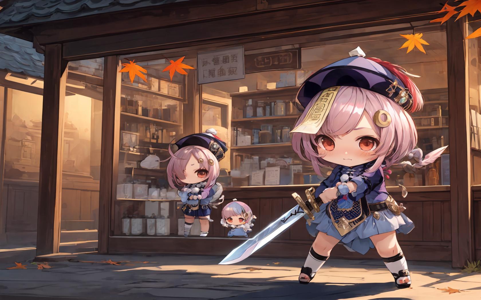 2girls, 3girls, architecture, autumn leaves, bangs, bead necklace, beads, blush, bookshelf, braid, chibi, closed mouth, coin hair ornament , dress, east asian architecture, falling leaves, hair ornament, hat, holding, holding sword, holding weapon, jewelry, jiangshi, leaf, long hair, long sleeves, looking at viewer, maple leaf, multiple girls, necklace, ofuda, outdoors, purple hair, purple headwear, qing guanmao, red eyes, shop, socks, standing, sword, weapon