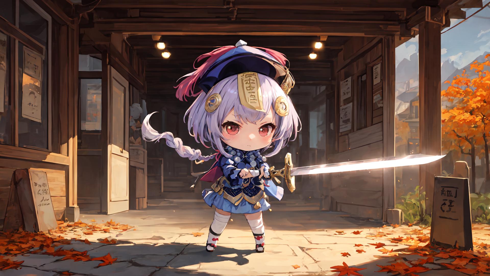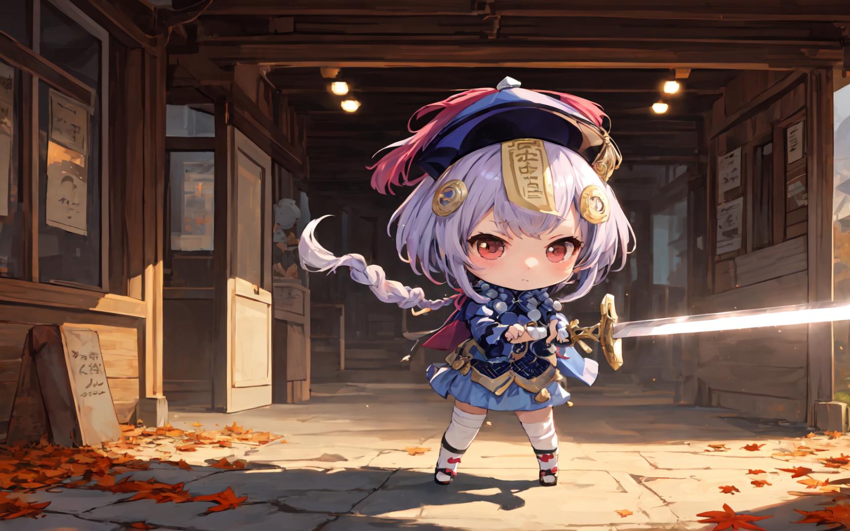 1girl, autumn leaves, bandaged leg, bandages, bangs, bead necklace, beads, braid, chibi, coin, coin hair ornament , falling leaves, full body, hair ornament, hat, holding, holding sword, holding weapon, jewelry, jiangshi, leaf, long hair, long sleeves, looking at viewer, maple leaf, necklace, ofuda, outdoors, purple hair, qing guanmao, red eyes, single braid, solo, standing, sword, thighhighs, vision (genshin impact), weapon, white thighhighs