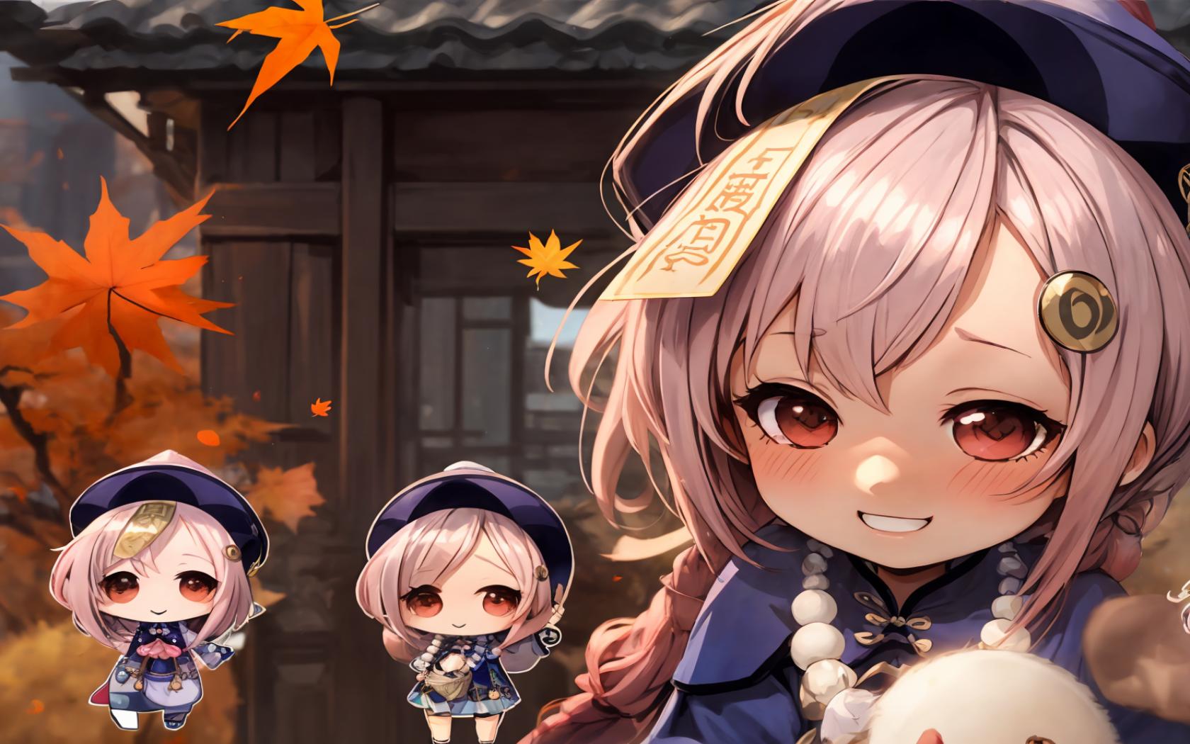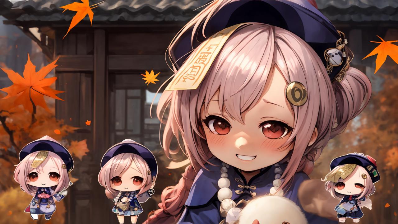 autumn leaves, bangs, bead necklace, beads, blue headwear, blush, braid, chibi, coin hair ornament , falling leaves, grin, hair ornament, hat, jewelry, jiangshi, leaf, long hair, long sleeves, looking at viewer, maple leaf, multiple girls, necklace, ofuda, outdoors, pink hair, purple hair, purple headwear, qing guanmao, red eyes, smile