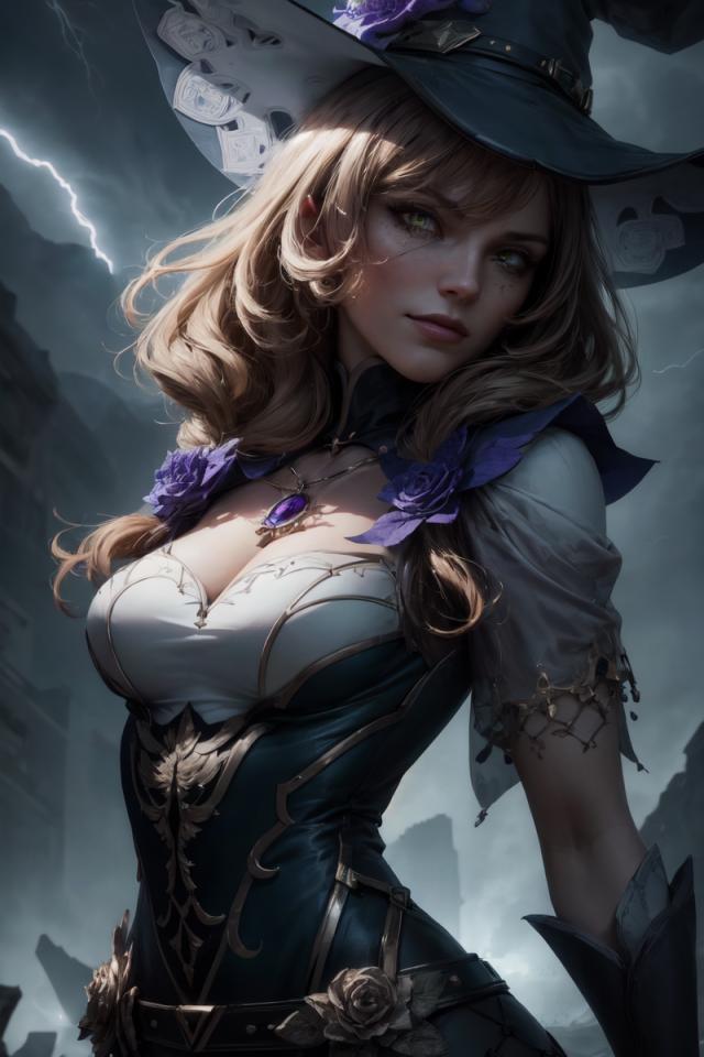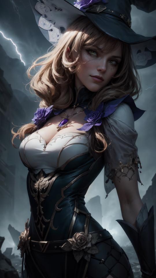 1girl, bangs, belt, brown hair, cleavage, cloudy sky, dress, flower, gloves, green eyes, hair flower, hair ornament, hat, hat flower, jewelry, large breasts, lightning, long hair, looking at viewer, medium breasts, multicolored dress, necklace, outdoors, pendant, purple flower, purple rose , realistic, rose, sky, solo, vision (genshin impact), witch, witch hat