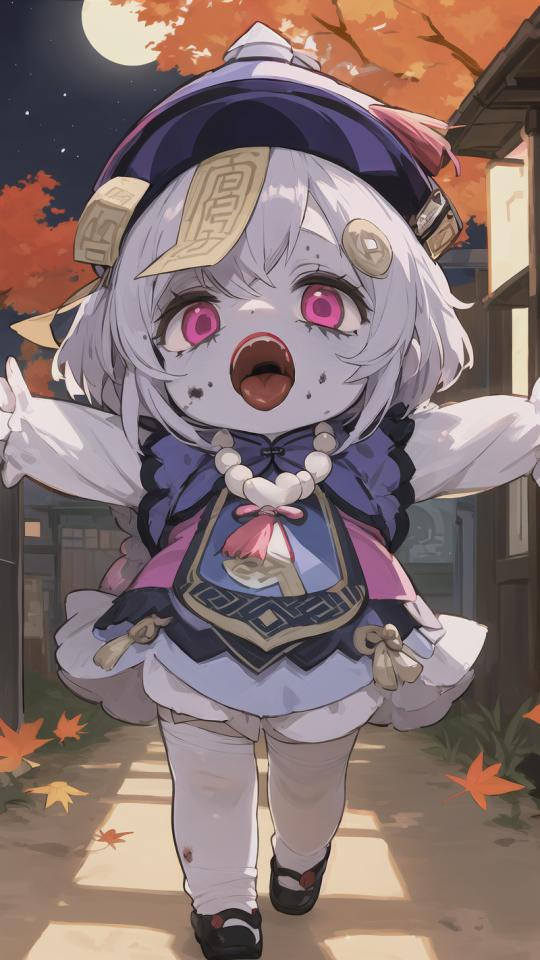 1girl, autumn leaves, bangs, bead necklace, beads, black footwear, coin hair ornament , dress, falling leaves, full body, full moon, hair ornament, hat, jewelry, jiangshi, leaf, long hair, long sleeves, looking at viewer, maple leaf, moon, necklace, night, night sky, ofuda, open mouth, outdoors, outstretched arms, pink eyes, purple eyes, purple hair, purple headwear, qing guanmao, saliva, sky, solo, standing, thighhighs, tongue, tongue out, tree, uvula