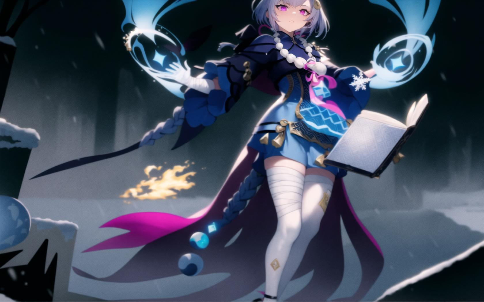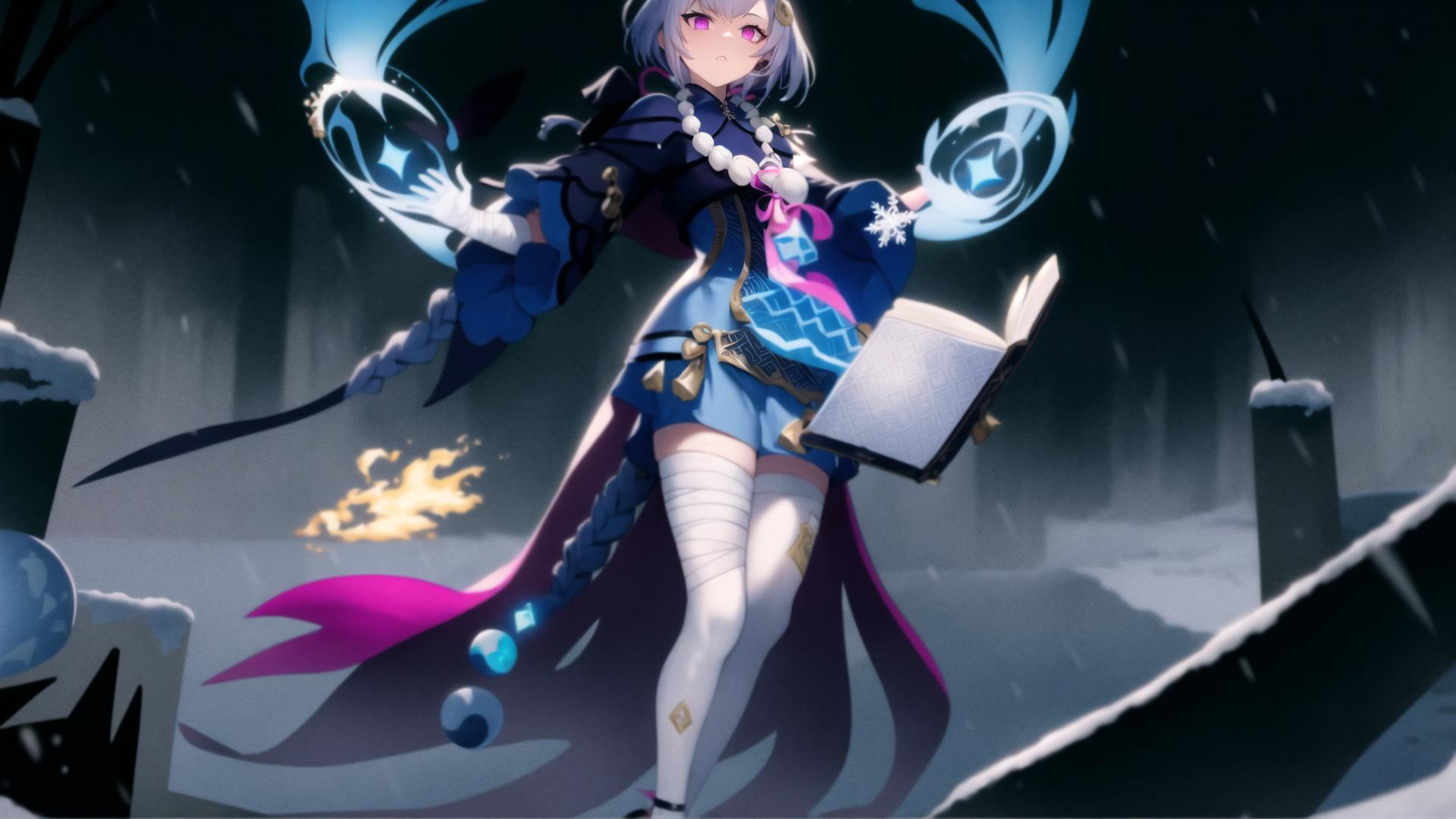 | Prompt | (highly detailed:1.5), (epic, dark fantasy art:1.6), (perfect artwork), best quality,,(8k), (4k),(Masterpiece), (Best Quality), extremely detailed, intricate, hyper detailed, (perfect face), illustration, clearly worked out detail, intricate, cinematic,(depth of field), <lora:qiqi1:1.6>qiqidef,1girl,bandaged leg,bandages, reading floating magic book, holding two floating magic ice orbs, dark dantasy background, snow, snowflakes, end of the world, ((powerful)), (snow,ice aura:1.6), snowshards, dark clouds,(((snowstorm))), tempest,wind, glowing blue sword on back, serious, focused, angry,, 1girl, bandaged arm, bandaged hand, bandaged leg, bandages, bangs, black footwear, blue dress, book, braid, braided ponytail, dress, fire, floating, hair ornament, long hair, long sleeves, looking at viewer, magic, ofuda, purple eyes, qiqi \(genshin impact\), short hair, single thighhigh, solo, spirit, thighhighs, virtual youtuber, white legwear, wide sleeves |