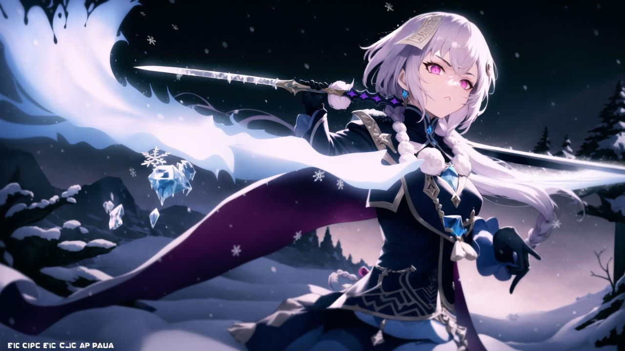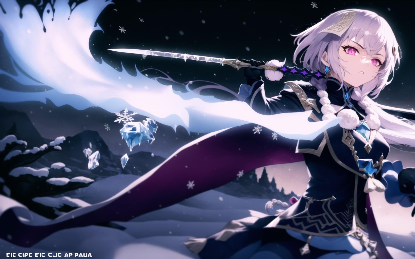 | Prompt | (highly detailed:1.5), (epic, dark fantasy:1.9), (perfect artwork), best quality,,(8k), (4k),(Masterpiece), (Best Quality), extremely detailed, intricate, hyper detailed, (perfect face), illustration, clearly worked out detail, intricate, cinematic,(depth of field), <lora:qiqi1:1.4>qiqidef,1girl,bandaged leg,bandages, dark dantasy background, snow, snowflakes, end of the world, ((powerful)), (snow,ice aura:1.6), snowshards,white cape, dark clouds,(((snowstorm))), tempest,wind, about to slash viewer with glowing blue sword behind her head, serious, focused, angry,, 1girl, bangs, bare tree, black gloves, braid, breasts, dress, gloves, hair ornament, holding, holding sword, holding weapon, long hair, looking at viewer, moon, night, night sky, outdoors, pink eyes, silver hair, sky, snow, snowflakes, snowing, solo, star \(sky\), starry sky, sword, thighhighs, tree, weapon |