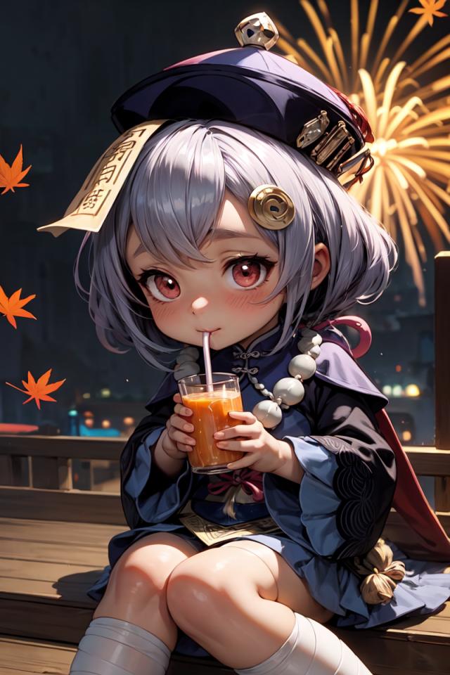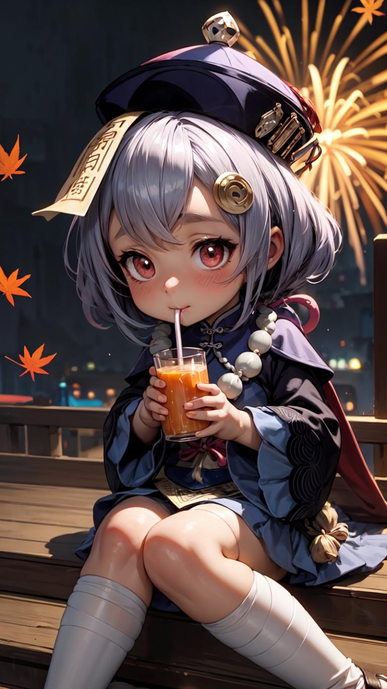 1girl, bandaged leg, bandages, bangs, bead necklace, beads, blush, coin hair ornament , cup, dress, drink, drinking, drinking straw, feet out of frame, fireworks, hair ornament, hat, holding, jewelry, jiangshi, kneehighs, long sleeves, looking at viewer, necklace, night, ofuda, outdoors, purple hair, qing guanmao, red eyes, sitting, socks, solo, thighhighs, vision (genshin impact), wide sleeves