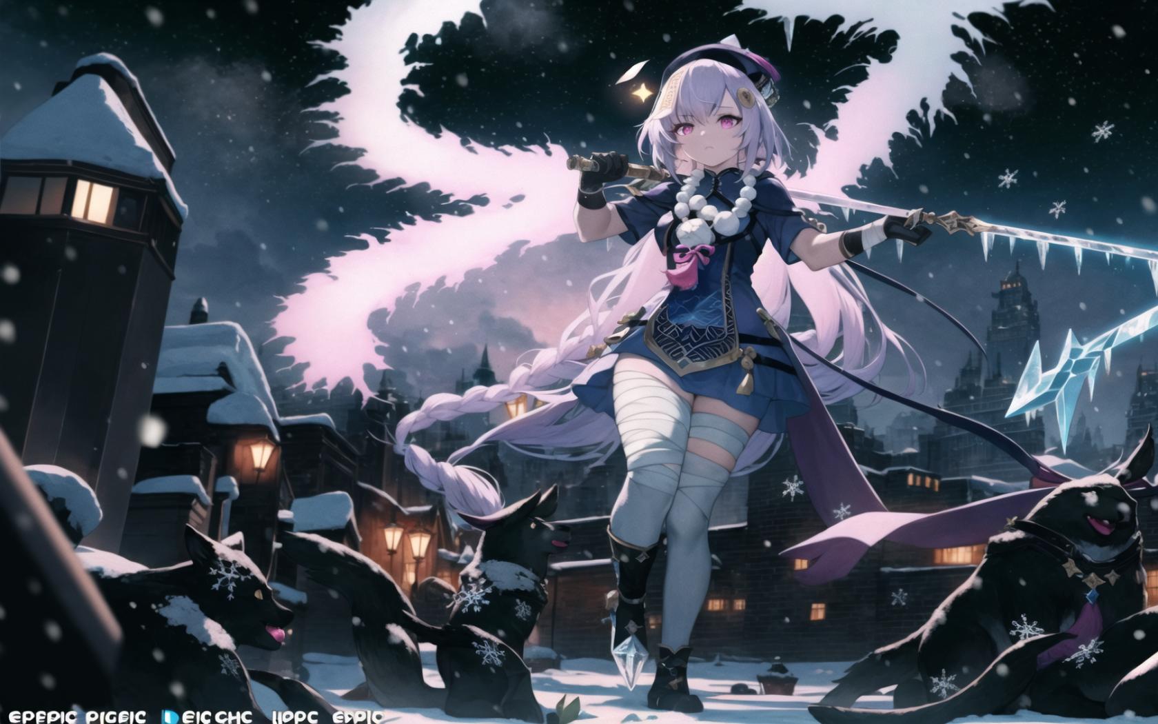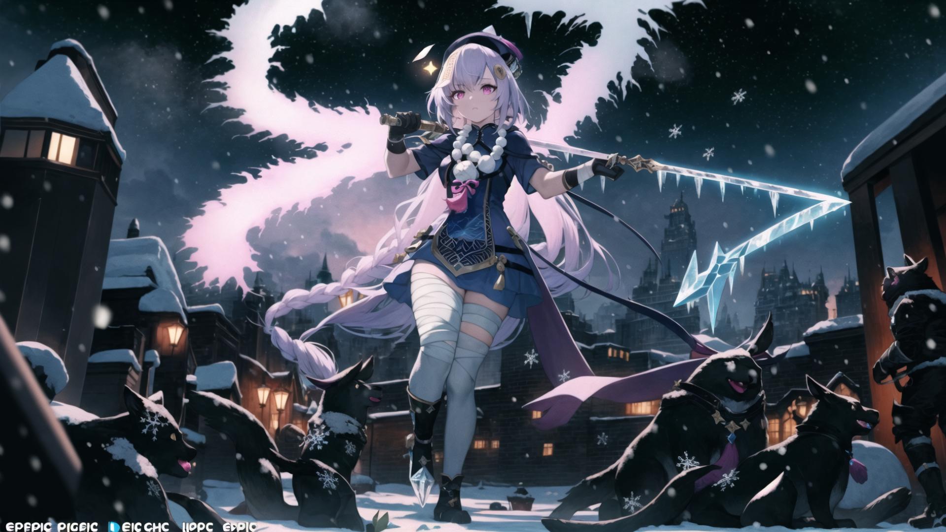 Prompt (highly detailed:1.5), (epic, dark fantasy:1.9), (perfect artwork), best quality,,(8k), (4k),(Masterpiece), (Best Quality), extremely detailed, intricate, hyper detailed, (perfect face), illustration, clearly worked out detail, intricate, cinematic,(depth of field), <lora:qiqi1:1.4>qiqidef,1girl,bandaged leg,bandages, dark dantasy background, snow, snowflakes, end of the world, ((powerful)), (snow,ice aura:1.6), snowshards,white cape, dark clouds,(((snowstorm))), tempest,wind, about to slash viewer with glowing blue sword behind her head, serious, focused, angry,, 1girl, aurora, bandage over one eye, bandaged arm, bandaged hand, bandaged head, bandaged leg, bandages, black gloves, braid, building, constellation, full moon, galaxy, gloves, hat, holding, holding weapon, leg wrap, light particles, long hair, milky way, moon, night, night sky, purple eyes, sarashi, shooting star, single thighhigh, sky, skyscraper, snow, snowing, space, star \(sky\), starry sky, starry sky print, telescope, thighhighs, very long hair, weapon