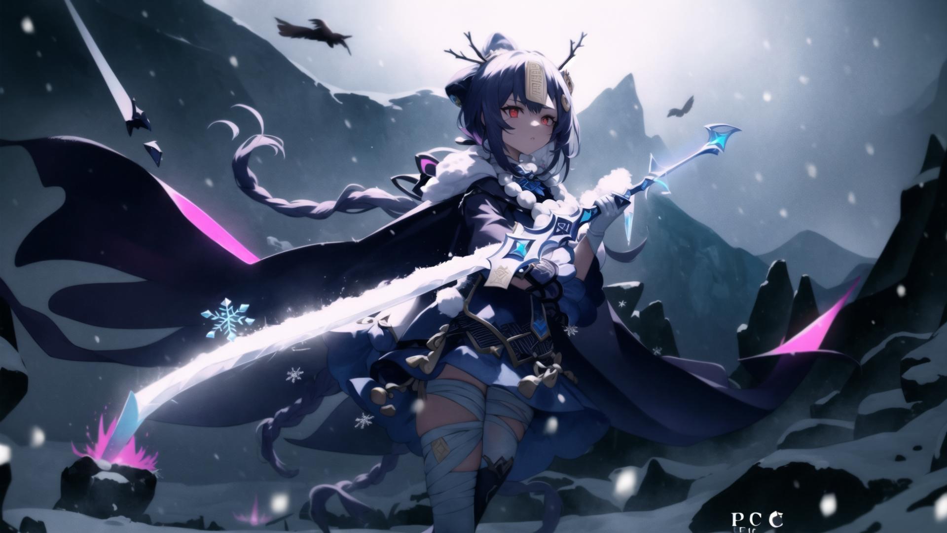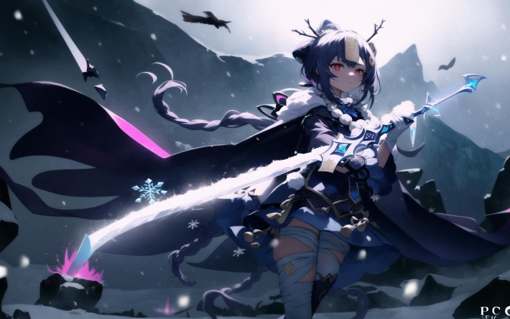 | Prompt | (highly detailed:1.5), (epic, dark fantasy:1.9), (perfect artwork), best quality,,(8k), (4k),(Masterpiece), (Best Quality), extremely detailed, intricate, hyper detailed, (perfect face), illustration, clearly worked out detail, intricate, cinematic,(depth of field), <lora:qiqi1:1.4>qiqidef,1girl,bandaged leg,bandages, dark dantasy background, snow, snowflakes, end of the world, ((powerful)), (snow,ice aura:1.6), snowshards,white cape, dark clouds,(((snowstorm))), tempest,wind, holding sword, holding, holding glowing blue sword, serious, focused, angry,, 1girl, bandaged arm, bandaged leg, bandages, bird, black cape, black gloves, blue cape, braid, cape, cloak, gloves, hair ornament, holding, holding sword, holding weapon, long hair, looking at viewer, moon, night, night sky, red eyes, snow, snowing, solo, star \(sky\), starry sky, sword, thighhighs, weapon, white cape |