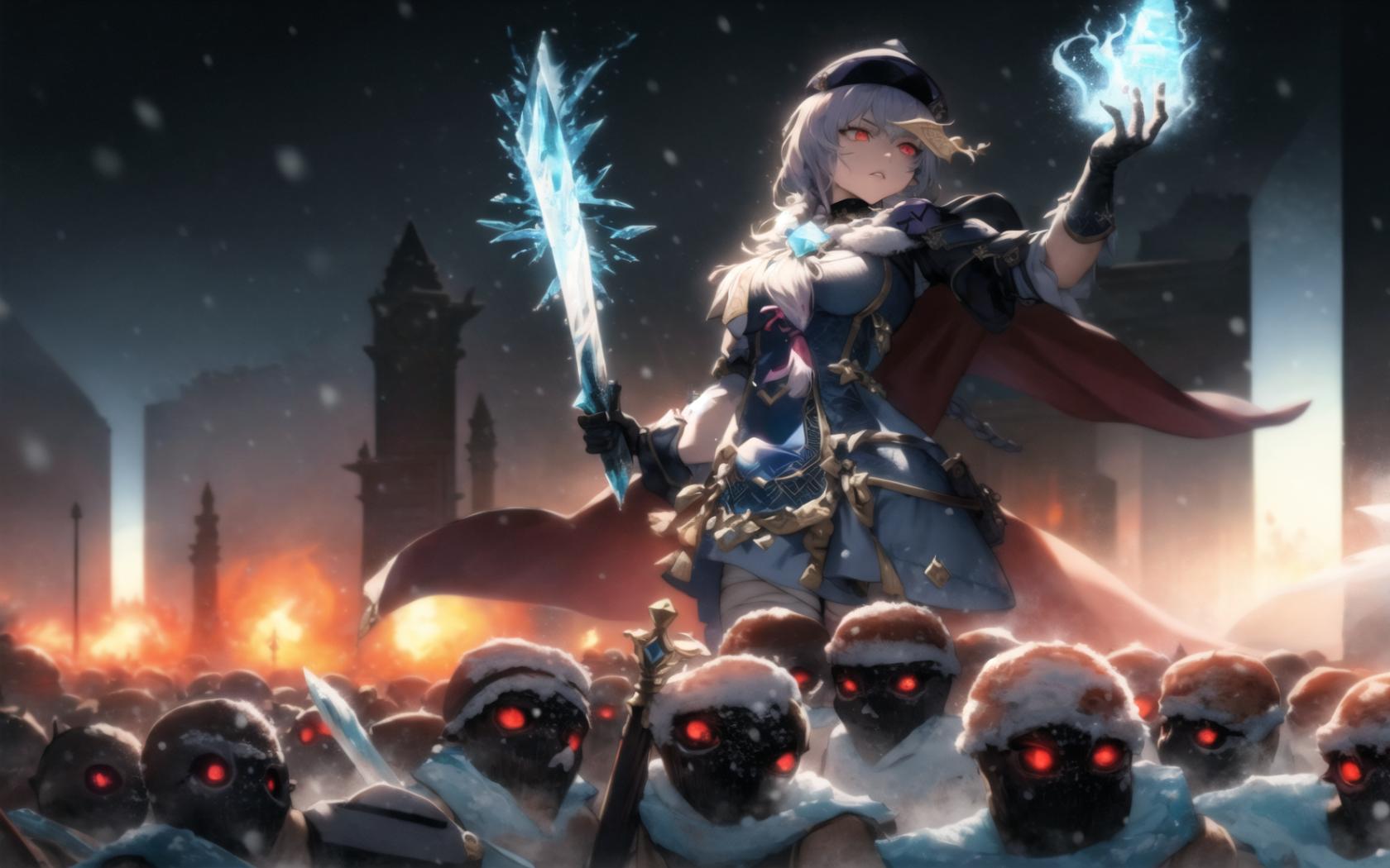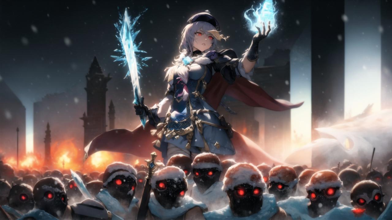 | Prompt | (highly detailed:1.5), (epic, dark fantasy:1.9), (perfect artwork), best quality,,(8k), (4k),(Masterpiece), (Best Quality), extremely detailed, intricate, hyper detailed, (perfect face), illustration, clearly worked out detail, intricate, cinematic,(depth of field), <lora:qiqi1:1.4>qiqidef,1girl,bandaged leg,bandages, zombi, dead, zombies,zombi,walking dead, dark dantasy background, snow, snowflakes, end of the world, ((powerful)), (snow,ice aura:1.6), snowshards,white cape, dark clouds,(((snowstorm))), tempest,wind, holding sword, holding, holding glowing blue ice orb, serious, focused, angry,, 1girl, armor, burning, cape, electricity, embers, fire, flame, gloves, glowing, glowing eyes, glowing weapon, hat, holding, holding weapon, long hair, magic, red eyes, silver hair, sky, weapon |
