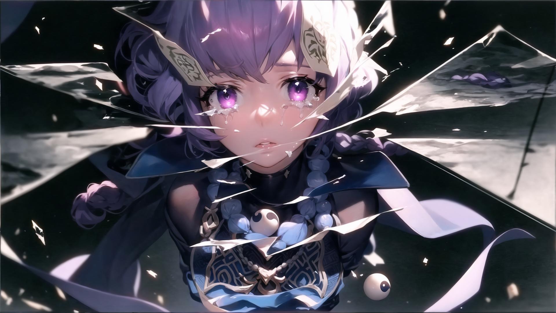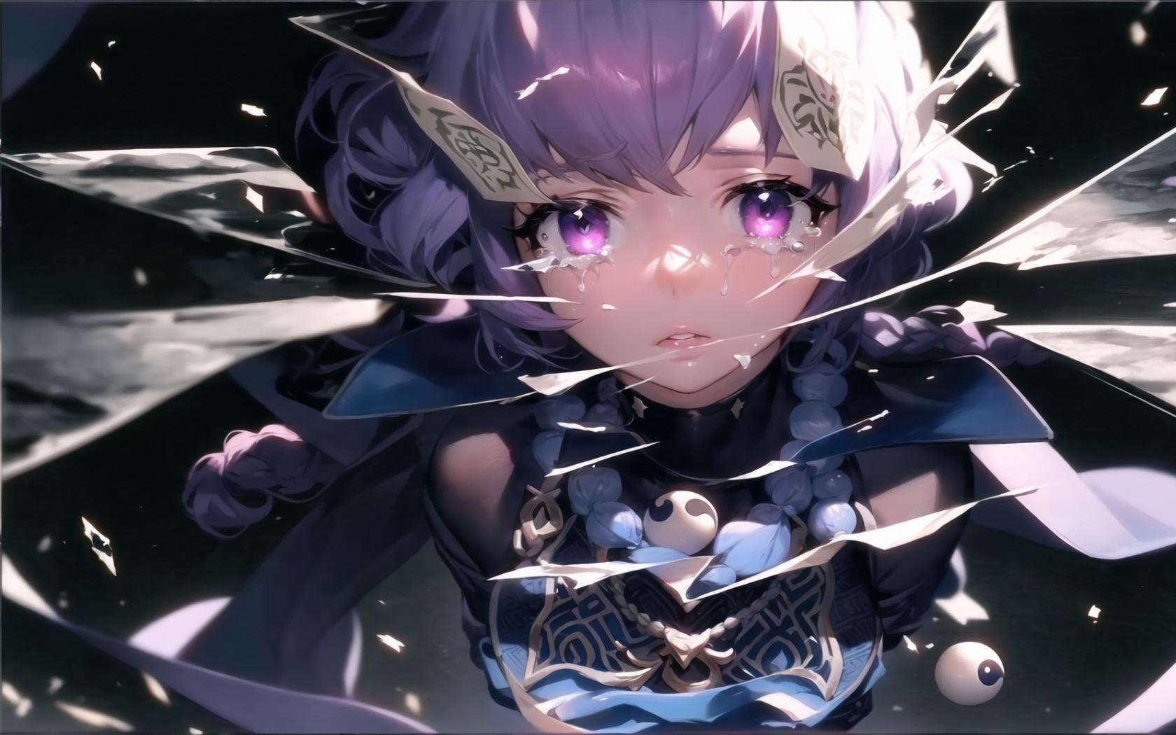 | Prompt | realistic,(dramatic lighting:1.2), (perfect artwork), best quality,sharp focus,(8k), (4k),(Masterpiece), (Best Quality), extremely detailed, intricate, hyper detailed, (perfect face), illustration, clearly worked out detail, intricate, cinematic,(depth of field) <lora:qiqi1:1.3>qiqidef,bandages,purple dress,banded arm, flat chest,shorts, very long hair,black jacket,yin yang, sad,tears,((broken mirror effect)),upper body, (shattered,shattering:1.7),parted lips, ((reflections on shattered mirror glass pieces in the air:1.4)), 1girl, bangs, braid, crying, crying with eyes open, facial, looking at viewer, purple eyes, purple hair, short hair, solo, tears |