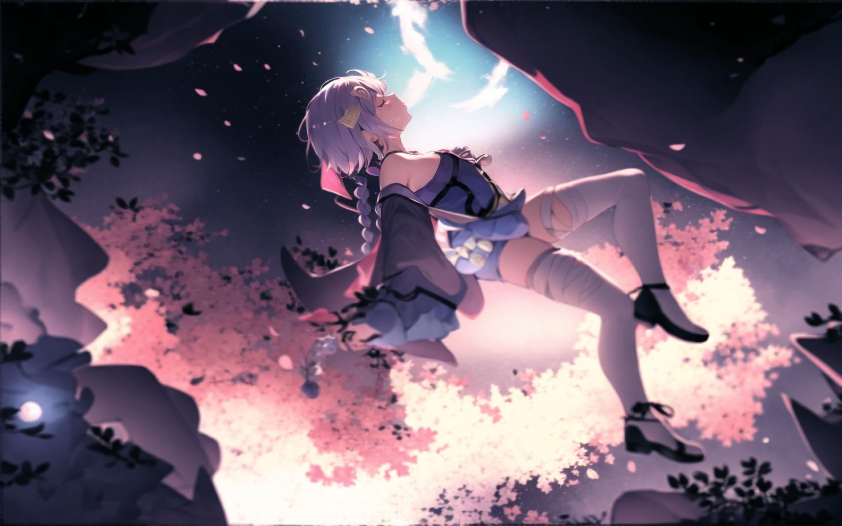 1girl, bandaged leg, bandages, bangs, bare shoulders, bead necklace, black footwear, braid, braided ponytail, cherry blossoms, closed eyes, coin hair ornament , dress, hair ornament, jewelry, jiangshi, long hair, long sleeves, necklace, night, ofuda, petals, purple hair, shoes, solo, thighhighs, tree, white thighhighs, wide sleeves