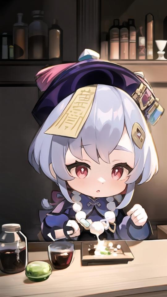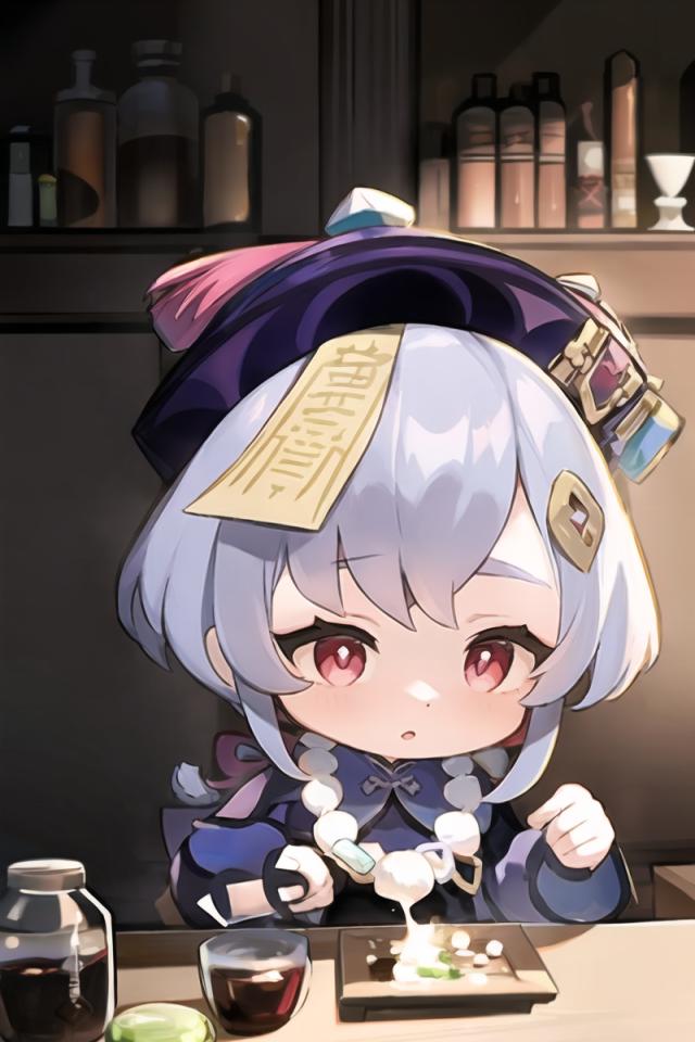 | Prompt | <lora:qiqi1:1.1>qiqidef, <lora:GenshinStickers:1>chibi style:1.9, ((alchemy lab, making potions)), |