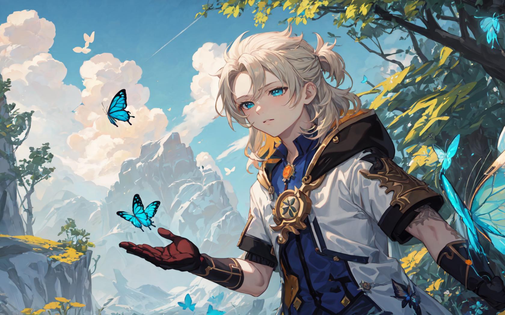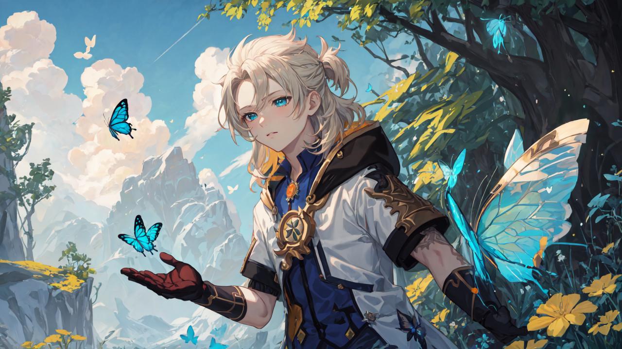 | Prompt | <lora:albedo:0.8>albedo (genshin impact), ((1boy, male focus)), gloves, solo, blue shirt, blue eyes, butterfly, shirt, black gloves, short sleeves, bangs,
