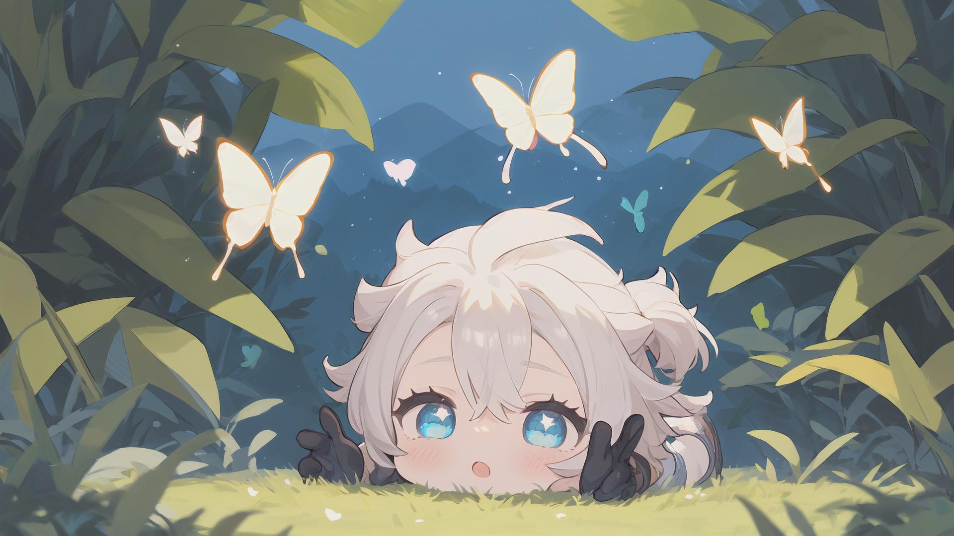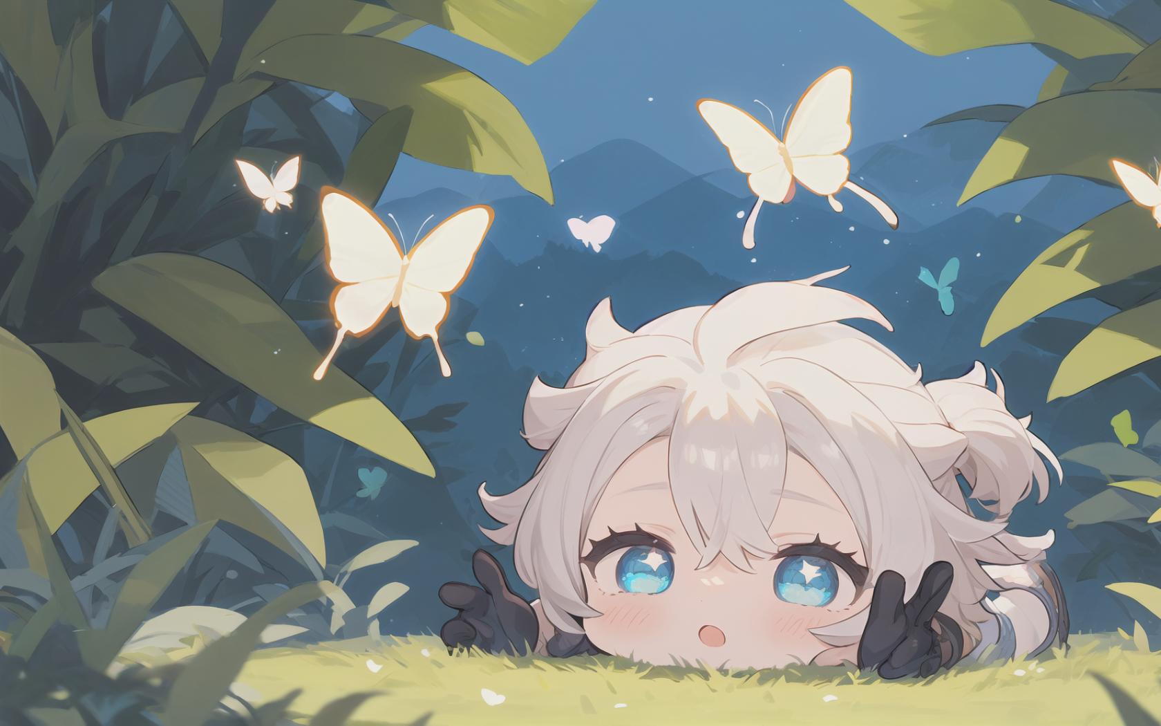 | Prompt | <lora:albedo:0.8>albedo (genshin impact), 1boy, male focus, gloves, ((solo)), blue shirt, blue eyes, butterfly, shirt, black gloves, short sleeves, bangs,