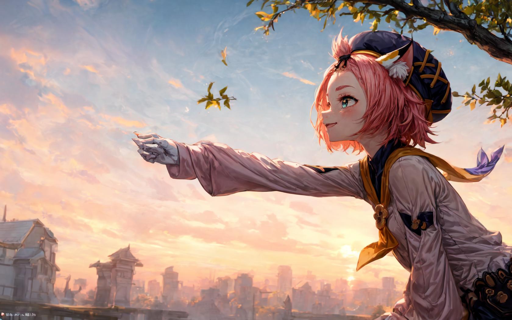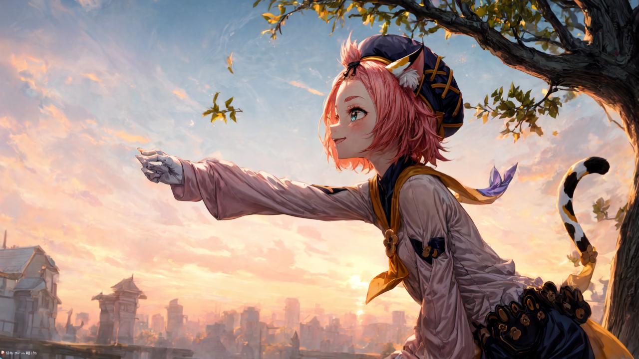 1girl, animal ear fluff, animal ears, bangs pinned back , beret, black headwear, blush, bug, building, cat ears, cat girl, cat tail, cloud, from side, green eyes, hat, long sleeves, neckerchief, open mouth, outdoors, outstretched arm, pink hair, profile, reaching, sailor collar, shirt, short hair, shorts, sky, smile, solo, sunset, tail, tree, white shirt